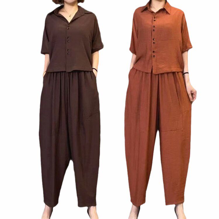 正品原版高档棉麻套装女2024夏季新款时尚减龄大码女装宽松两407