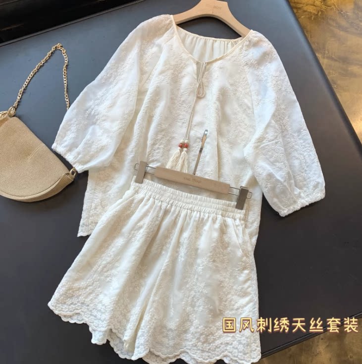 THEWOW 度假风 立体饱满刺绣天丝棉七分灯笼袖微宽松上衣短裤套装