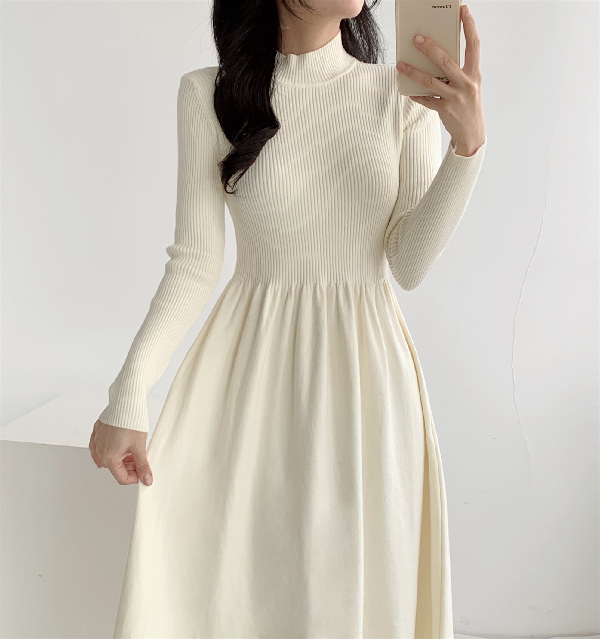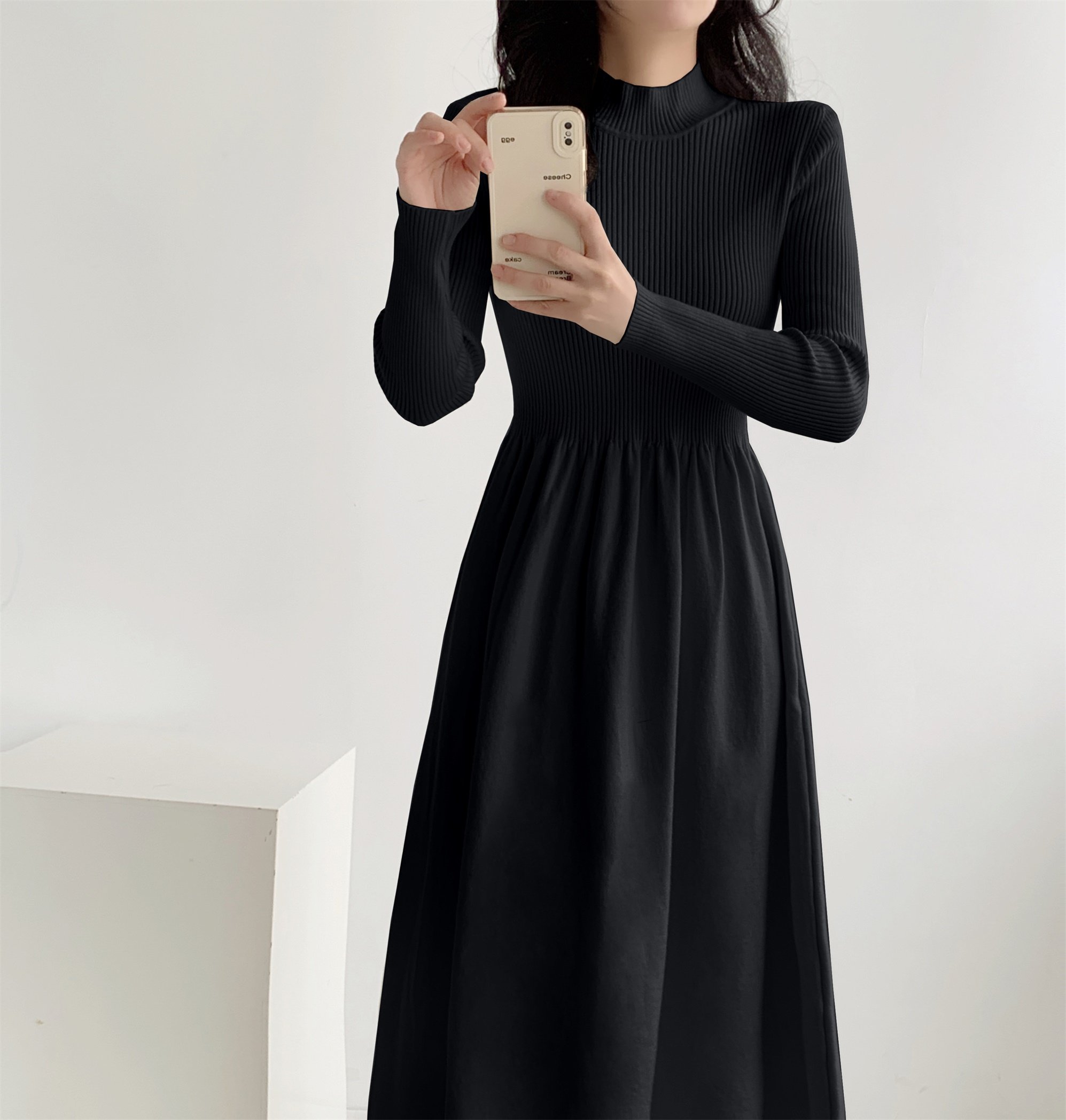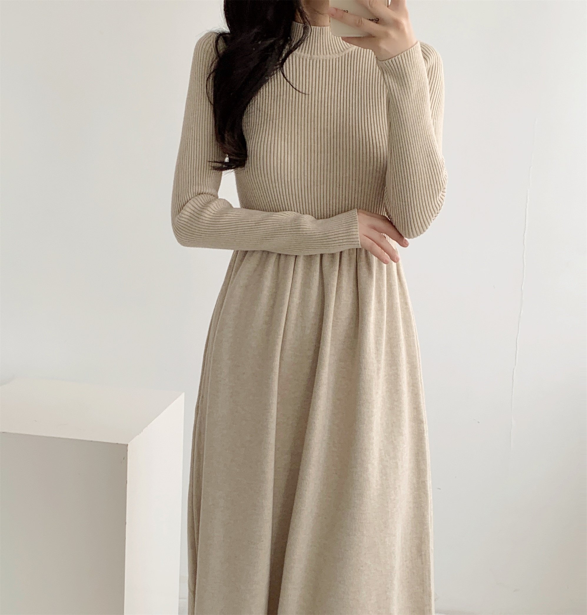 淘宝盛靓靓女装,赫本风拼接半高领A字连衣裙女秋冬款收腰修身显瘦小众针织裙