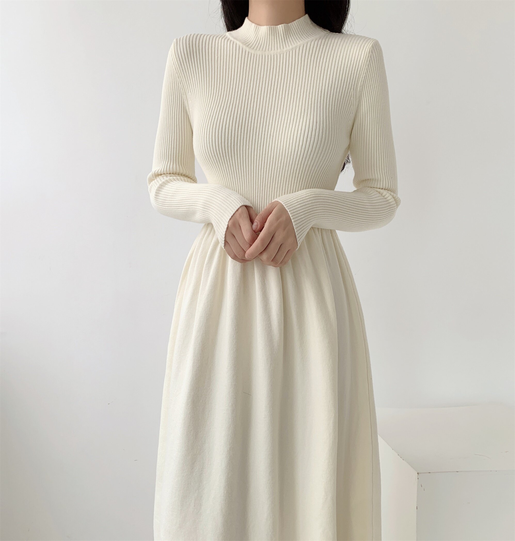 赫本风拼接半高领A字连衣裙女秋冬款收腰修身显瘦小众针织裙