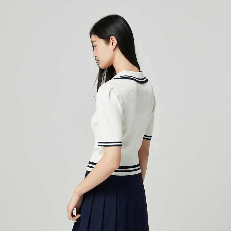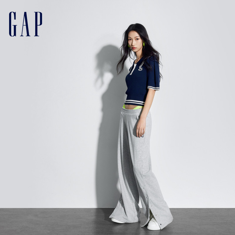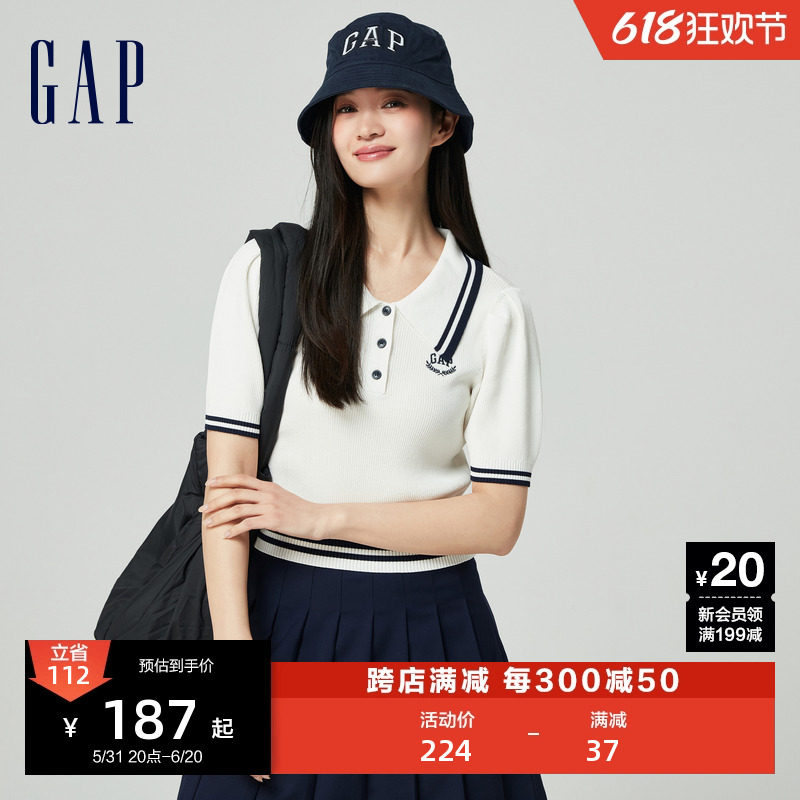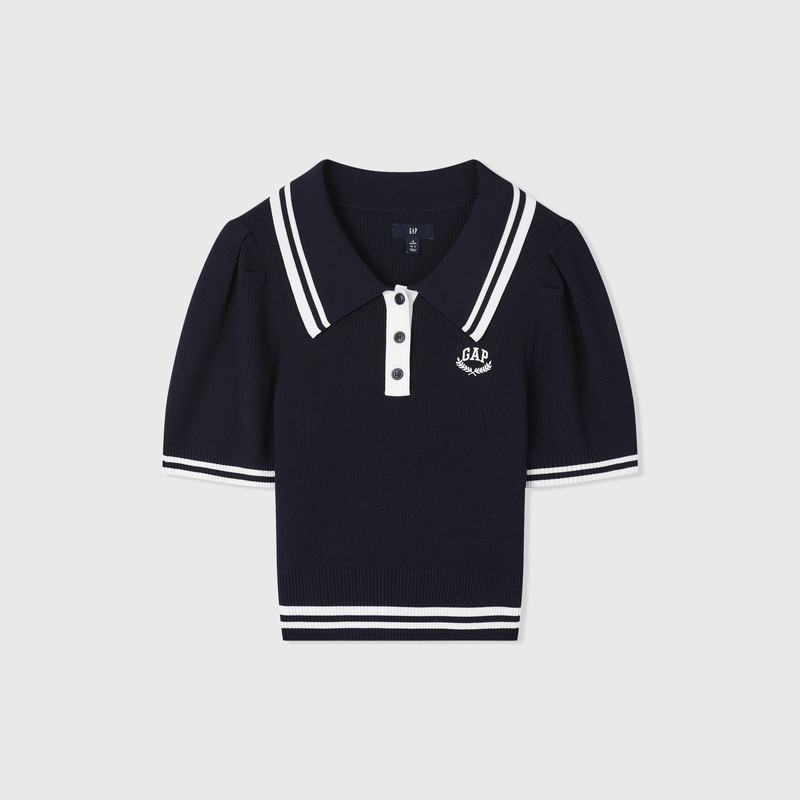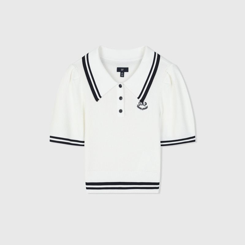 Gap女装2024春夏新款LOGO撞色条纹泡泡袖翻领针织衫短上衣891736