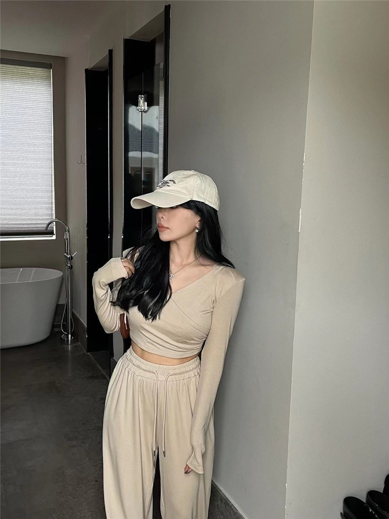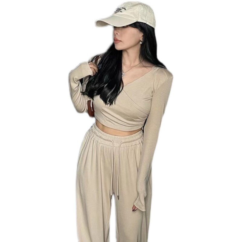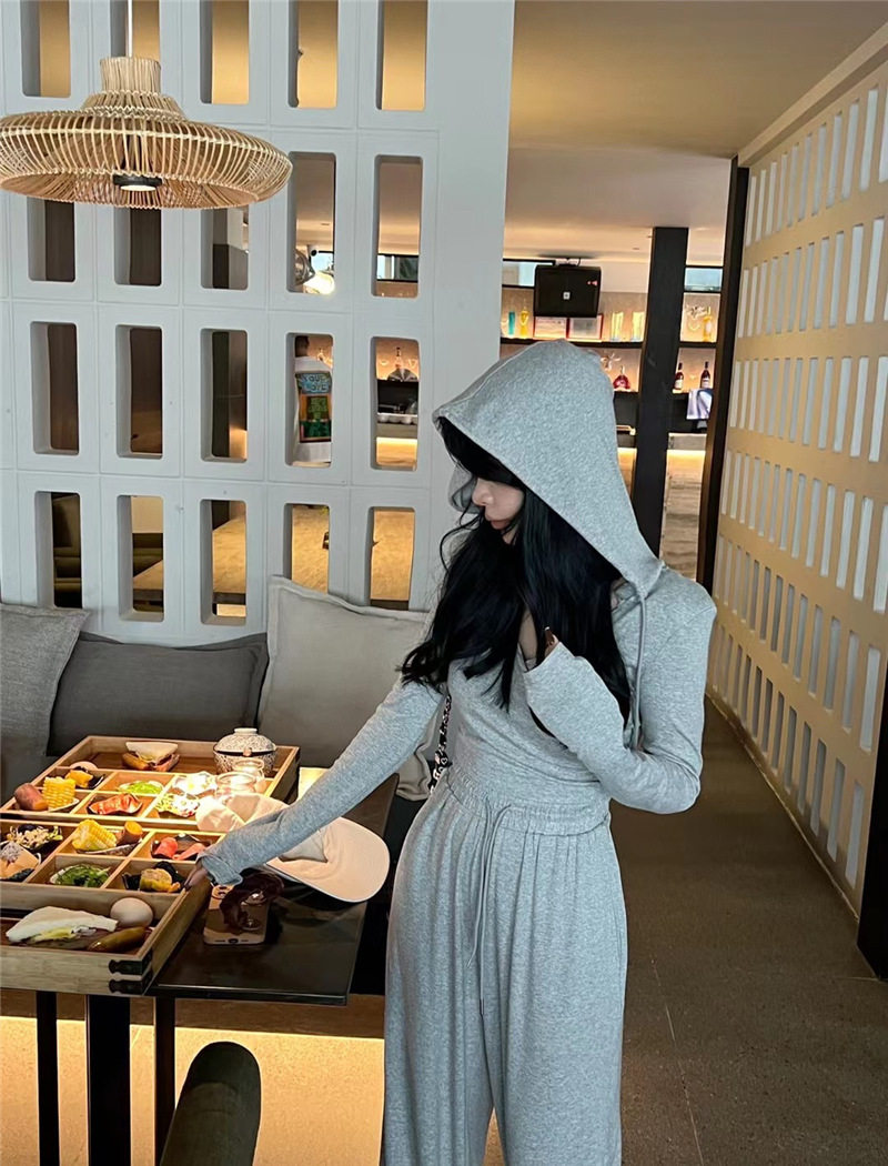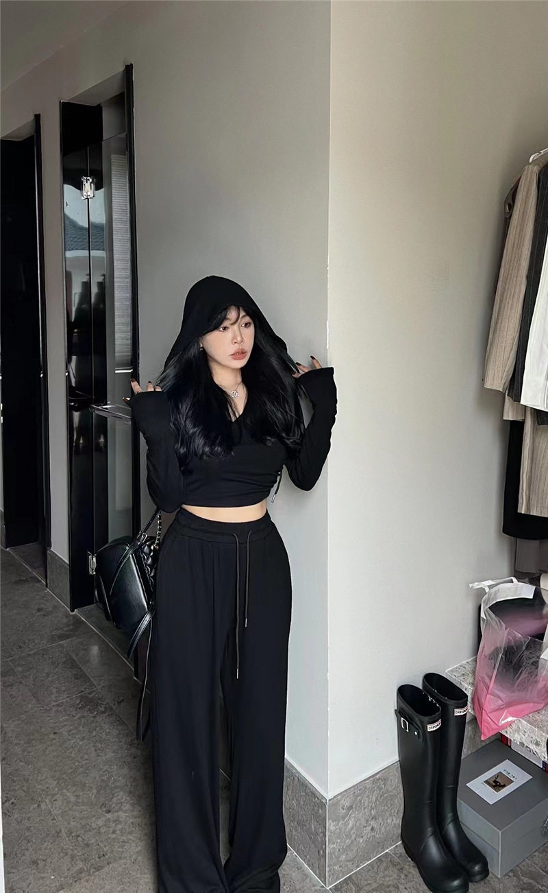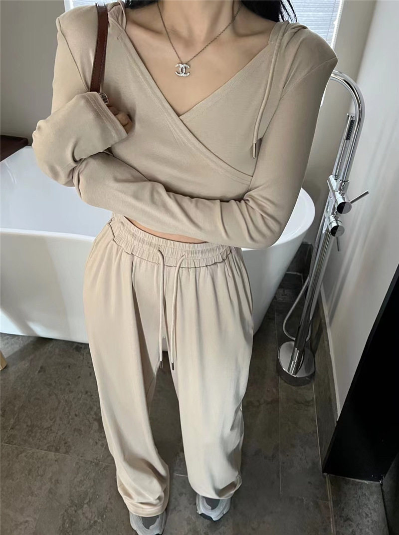 淘宝Vanna韩国ulzzang女装店,Vanna韩国ALA秋季新款时尚交叉V领连帽长袖上衣+抽绳阔腿裤套装女