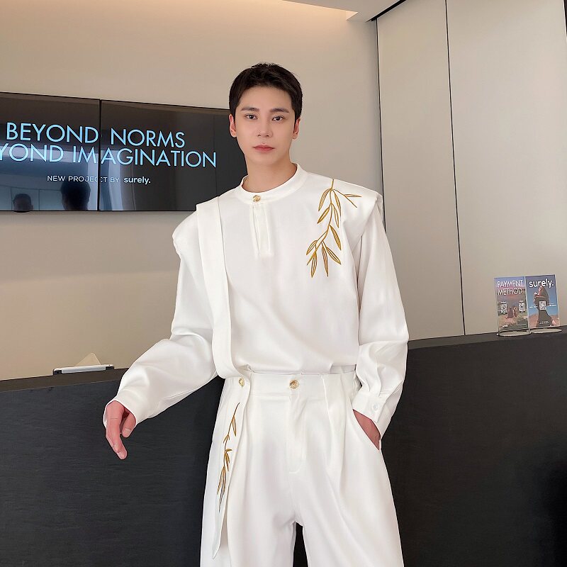 高级感复古刺绣竹子衬衫套装男小众设计感阔…