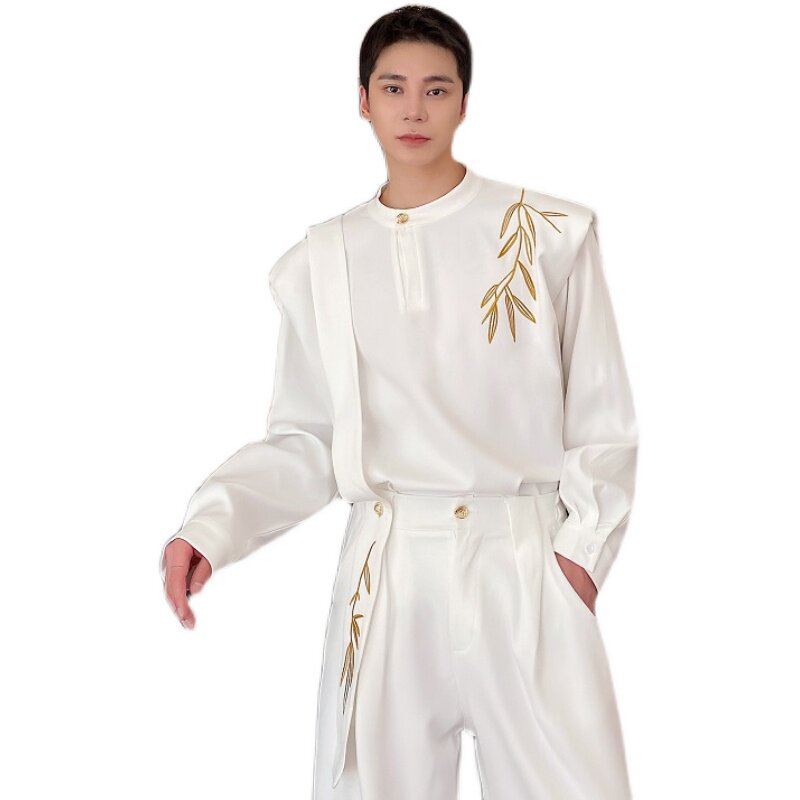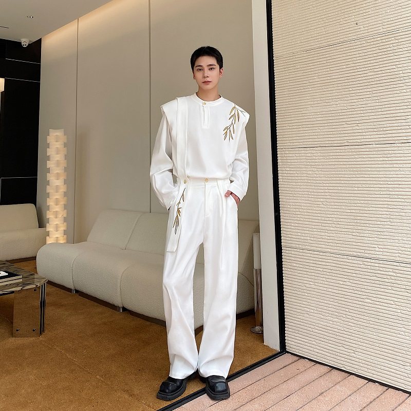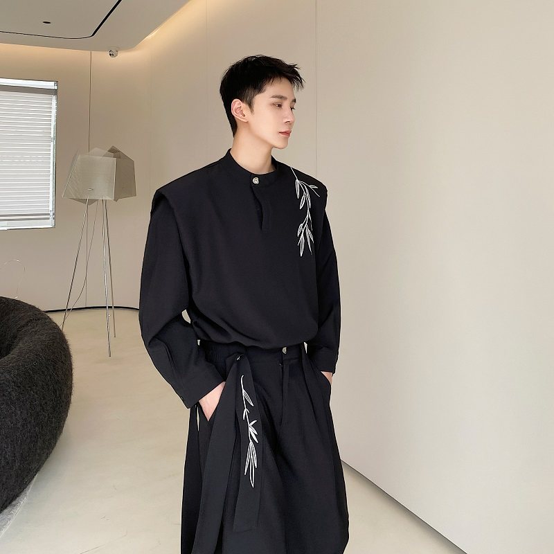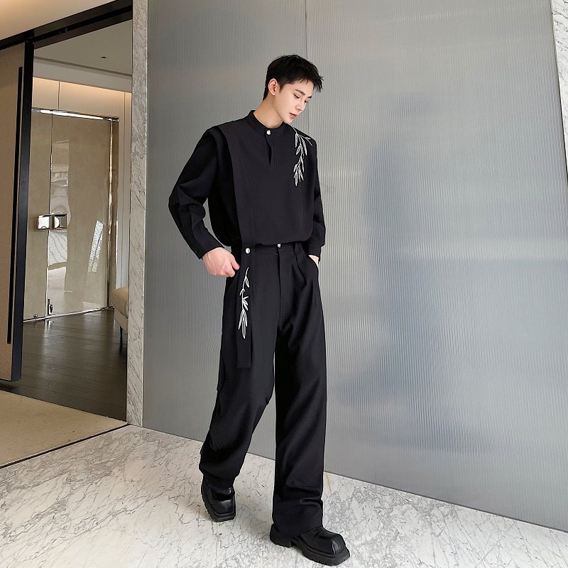 高级感复古刺绣竹子衬衫套装男小众设计感阔腿裤新中式国风两件套