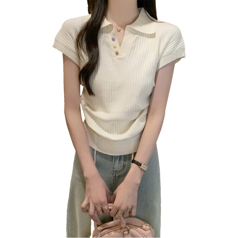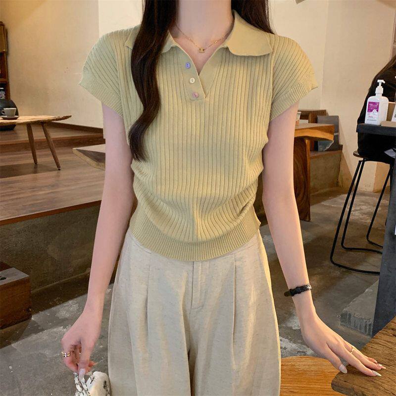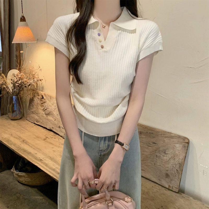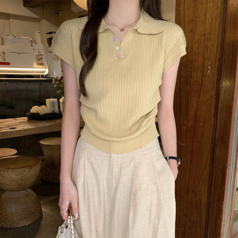 上衣实拍2025春夏领韩版气质olo褶皱纽扣设计感p坑条针织衫短袖