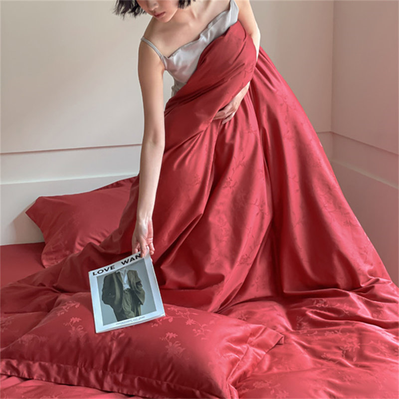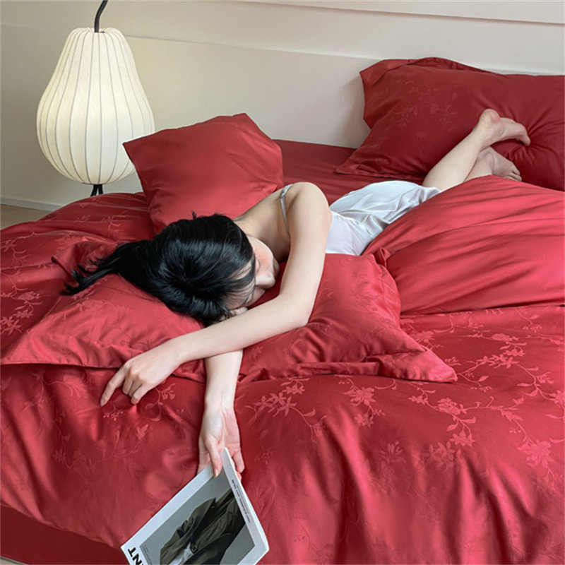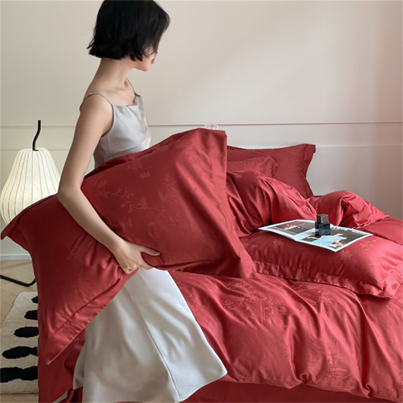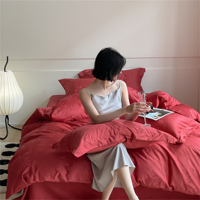 婚庆全棉四件套长绒棉60提花被套床单结婚纯棉酒红色简约床上用品