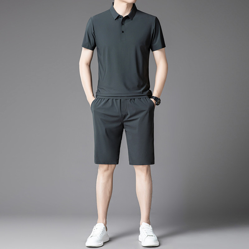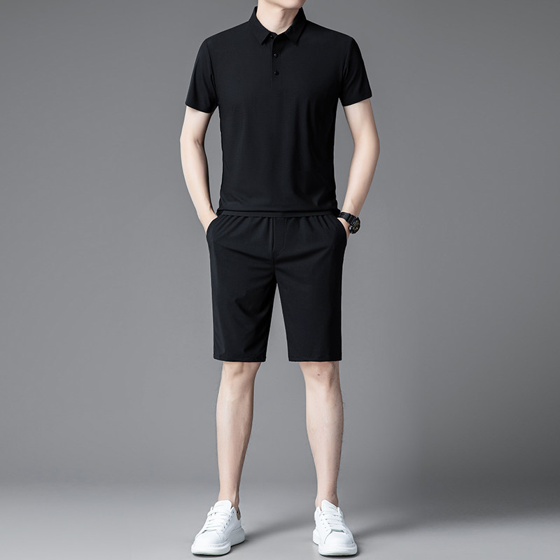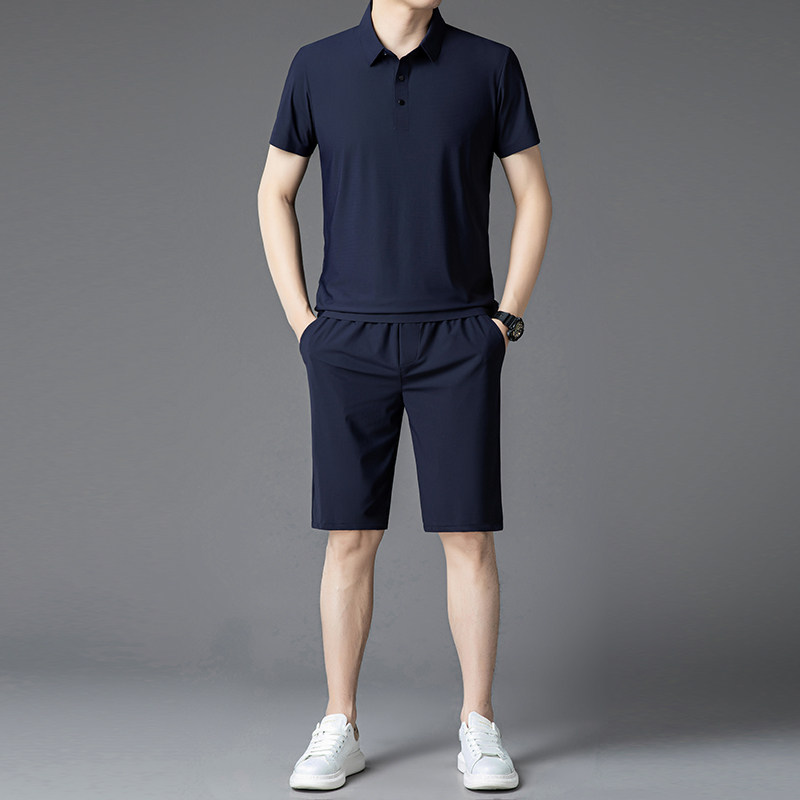 夏季冰丝短袖套装男士休闲运动服中年爸爸装翻领POLO衫两件套男