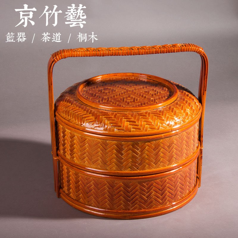 淘宝千年古屋,新品竹编圆形食盒提篮蓝二层送餐篮