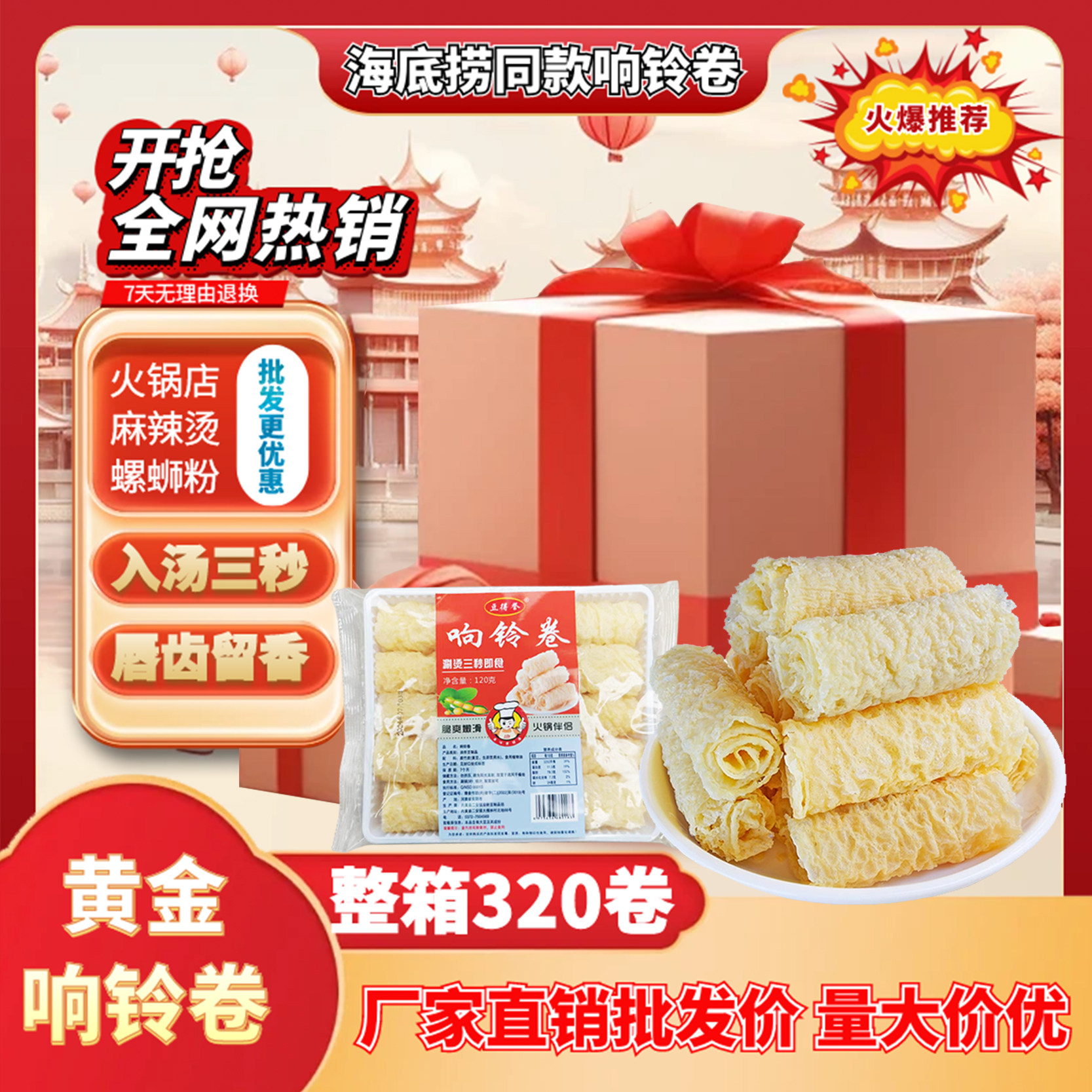 黄金卷脆铃卷响铃卷油豆腐皮卷油炸腐竹皮火锅麻辣烫商用批发32盒