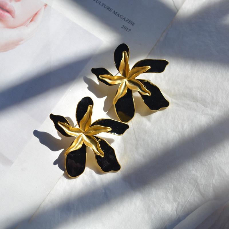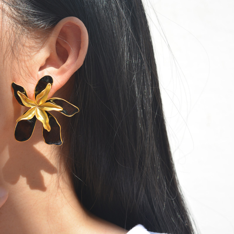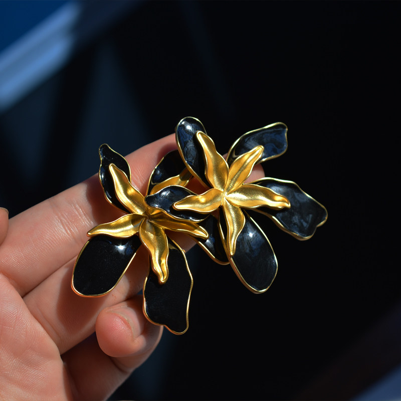 中古气质大花瓣耳钉双层花朵金色夸张耳环小众高级感黑色大花耳饰