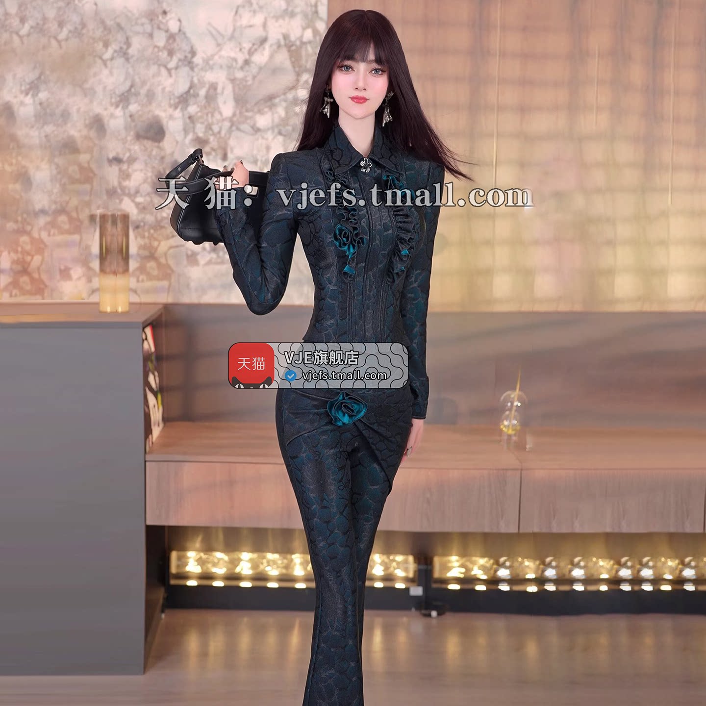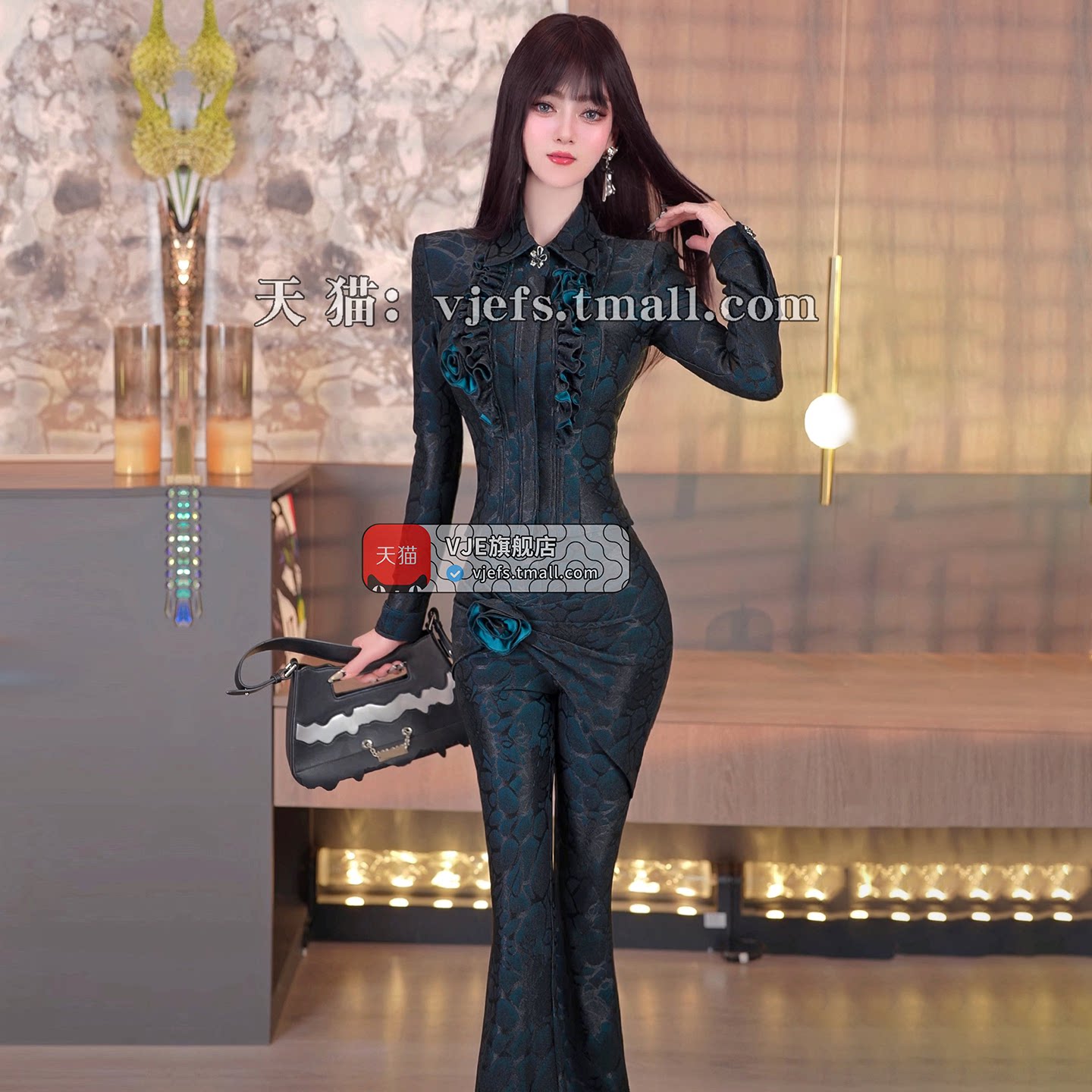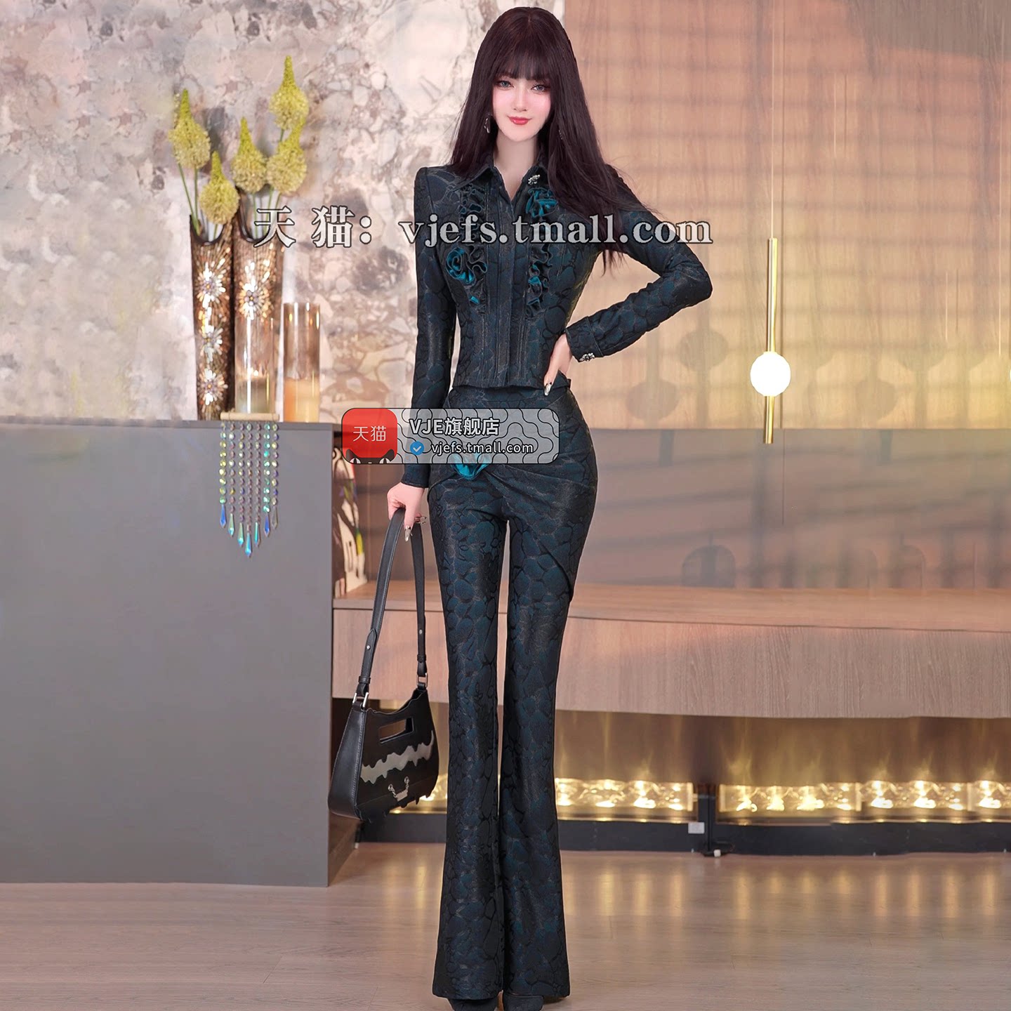 天猫vje旗舰店,VJE春季设计感荷叶边盘花外套微喇叭裤两件套2026新款OL小众套装