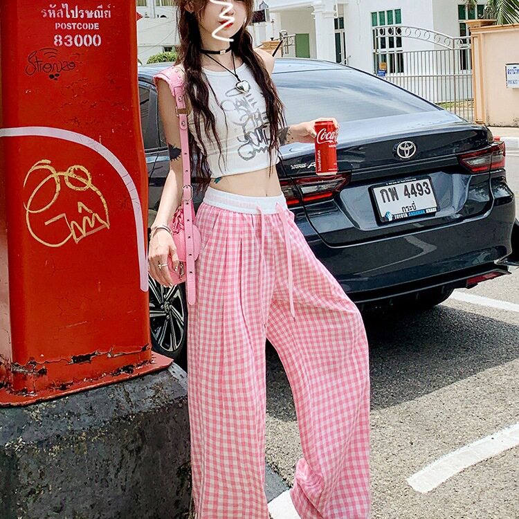 淘宝莓屋小仙,多巴胺慵懒风格子裤女夏季薄款高腰宽松休闲直筒裤垂感粉色阔腿裤