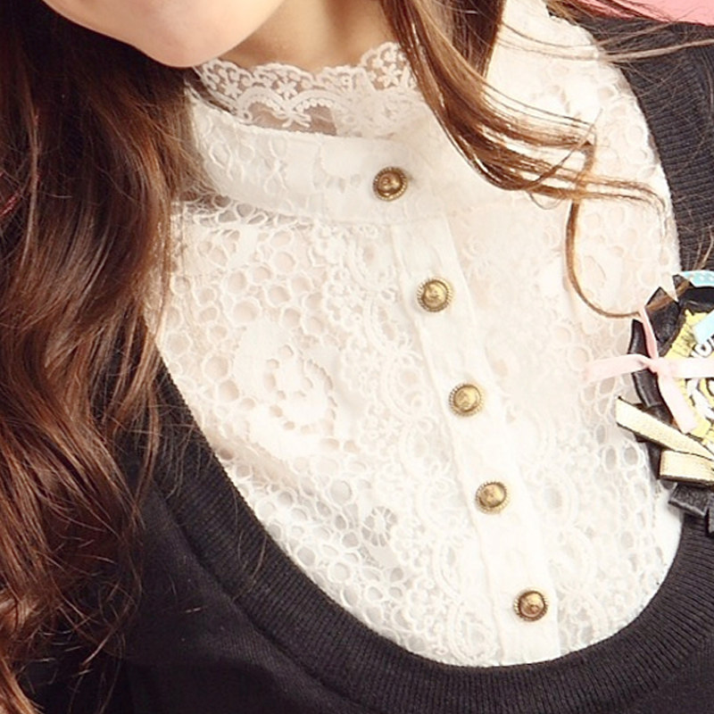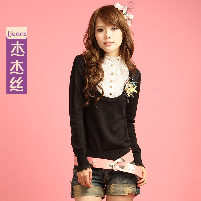 美潮8 杰杰丝女装 韩版镂空性感蕾丝领口拼接针织衫毛衣 春装