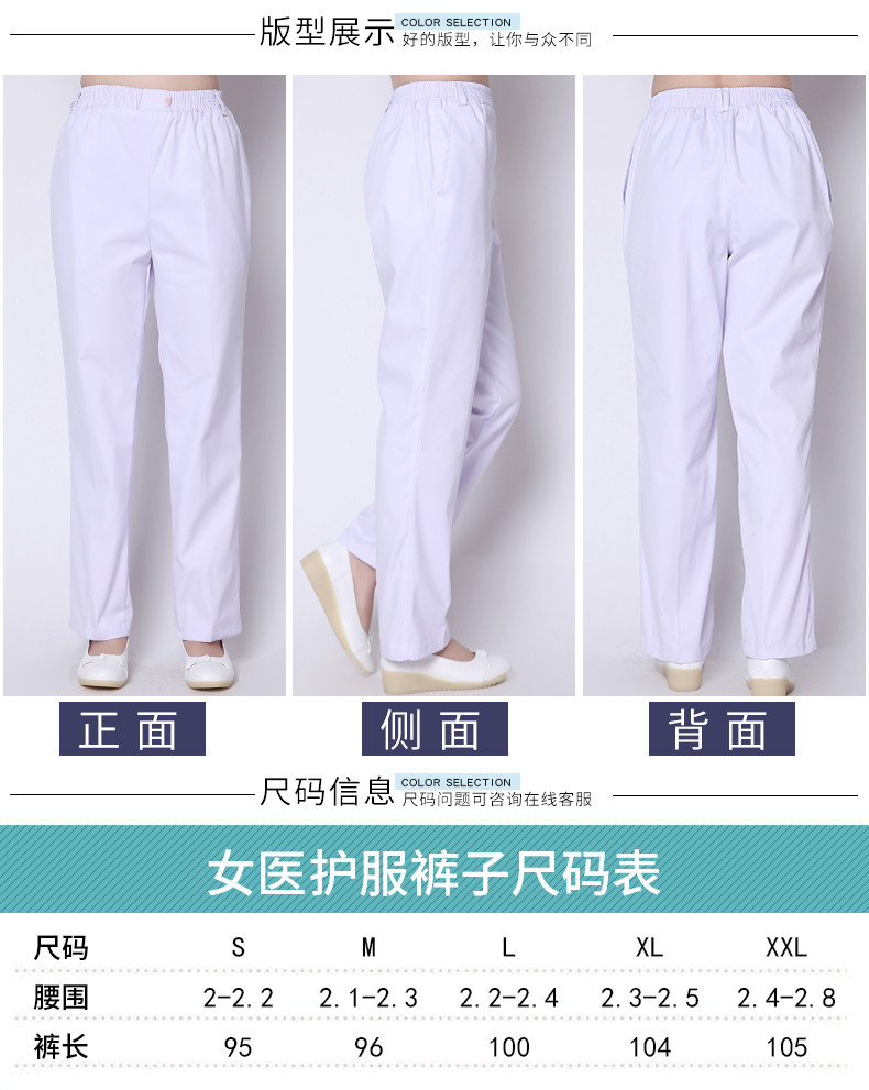 淘宝高端时尚医护服,护士裤白色松紧腰蓝色粉色医院