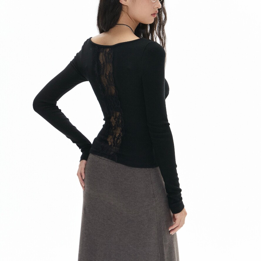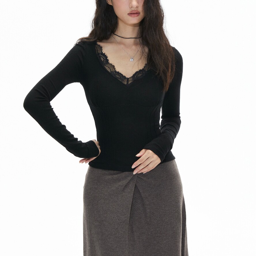 法式纯欲v领小露背蕾丝打底衫女