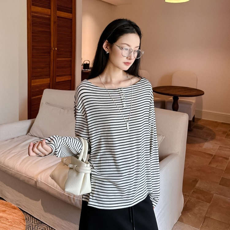 Tania 2025秋季韩版时尚慵懒极简风条纹宽松纽扣领T恤羊毛针织衫