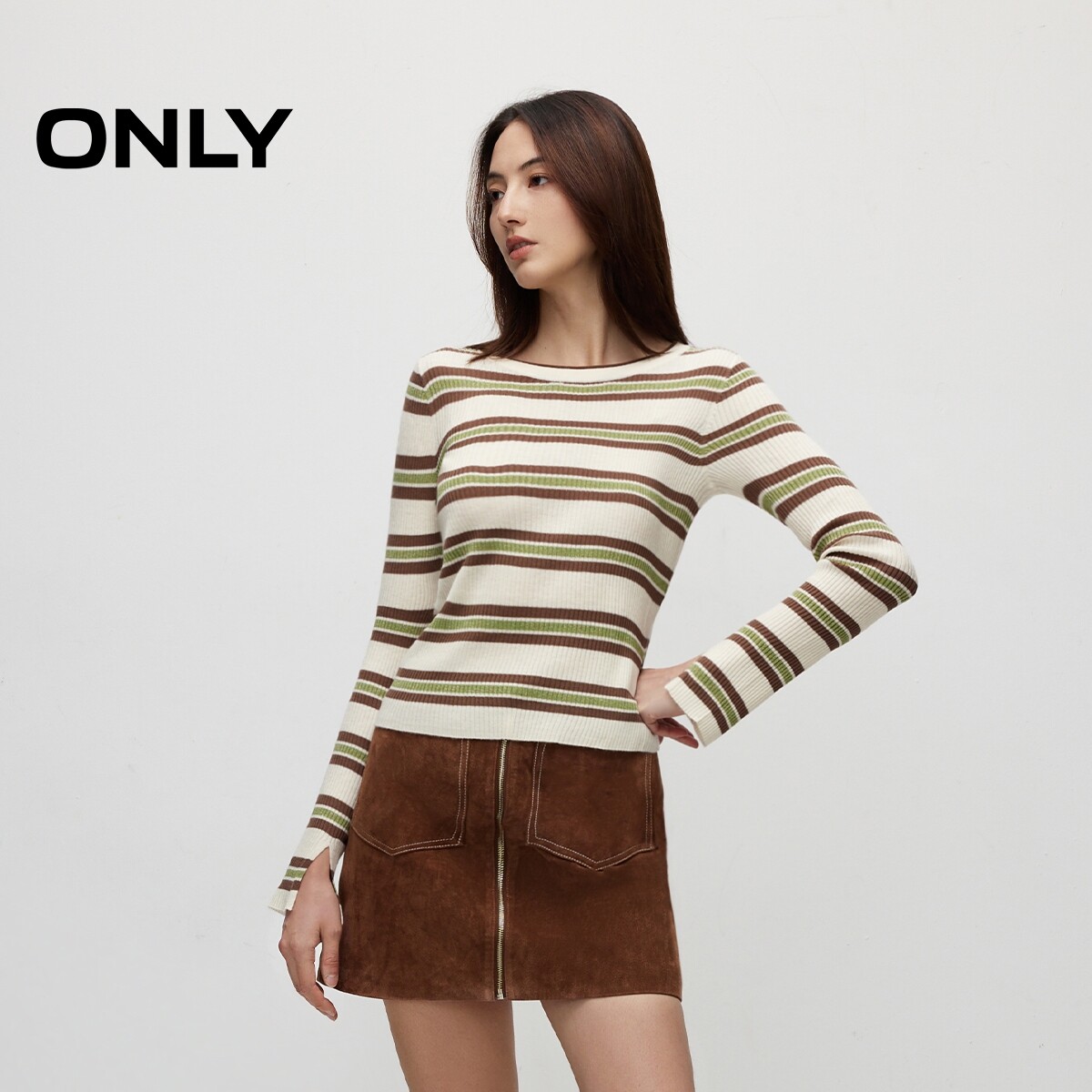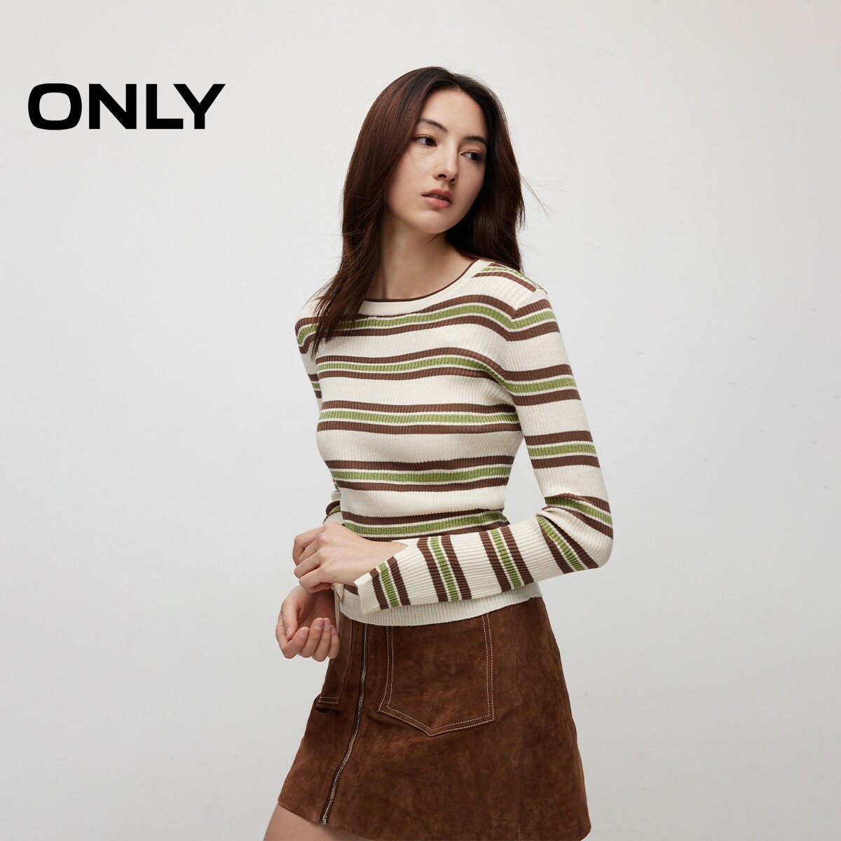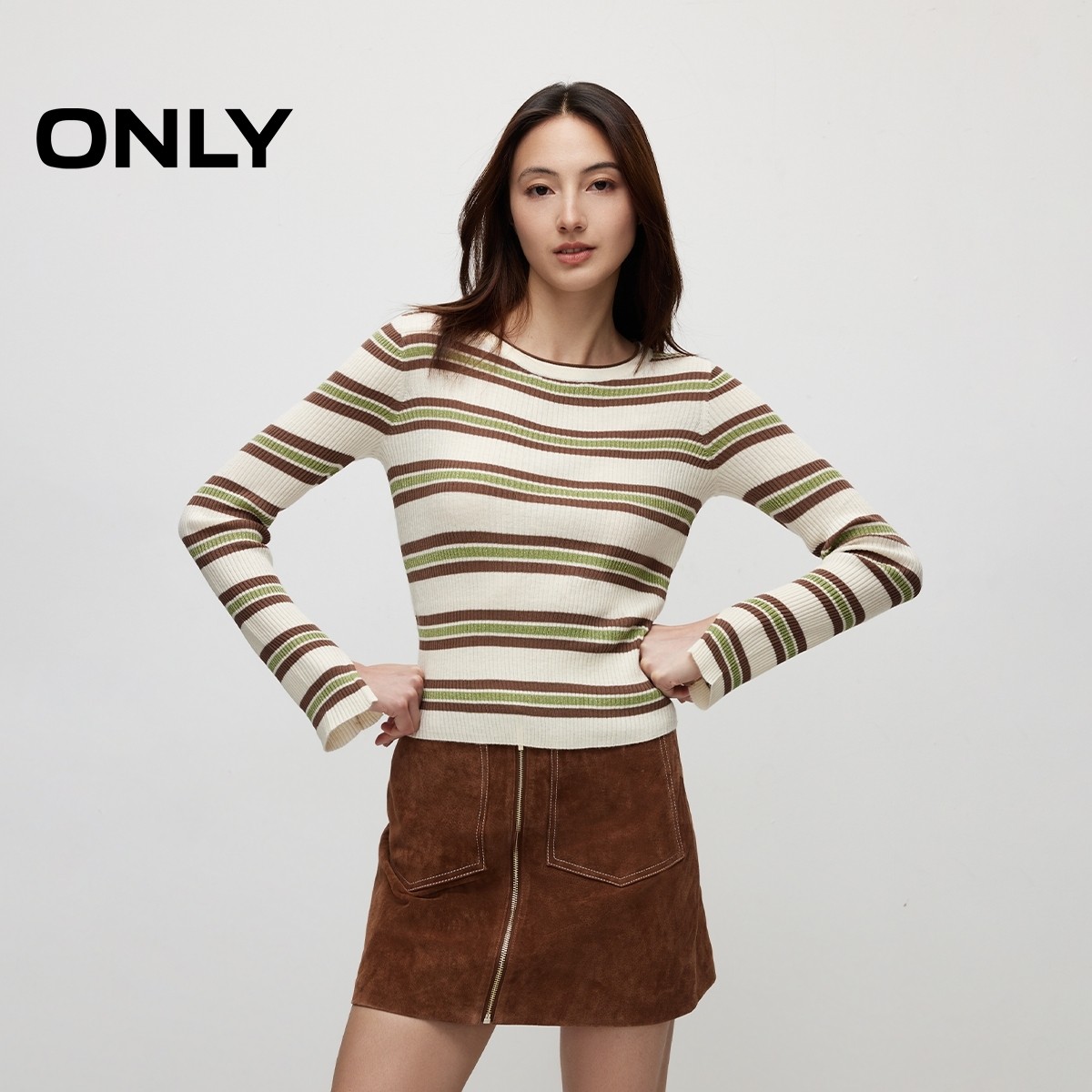ONLY2024秋冬新款日常舒适圆领条纹显瘦长袖针织衫女|124313024