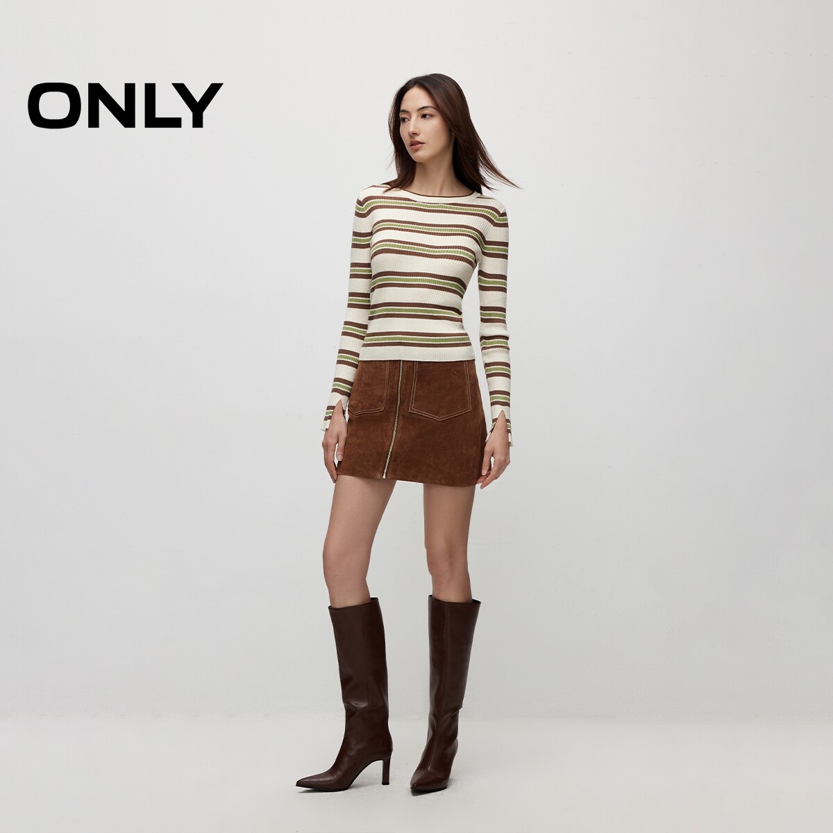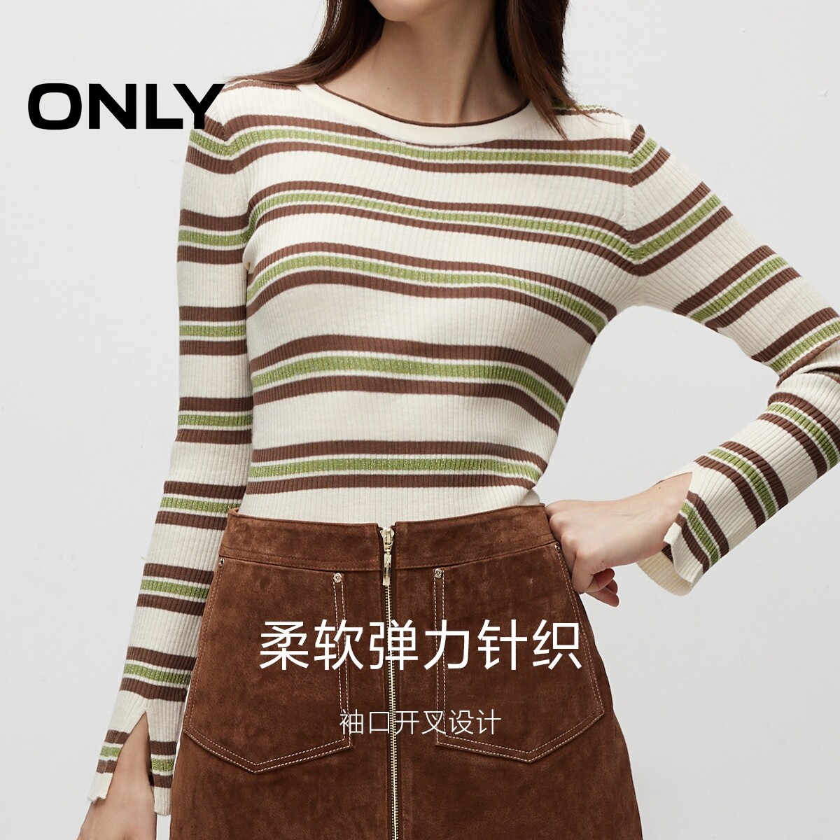 天猫ONLY官方旗舰店,ONLY圆领条纹显瘦长袖针织衫,视觉显瘦条纹 柔软弹力针织 长袖开叉设计