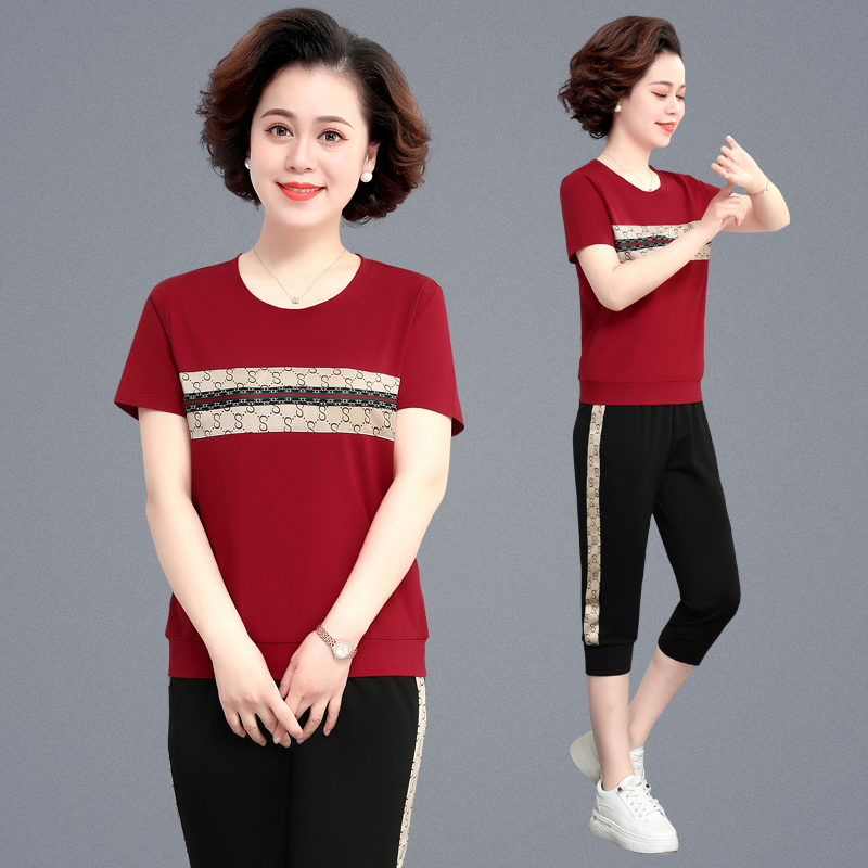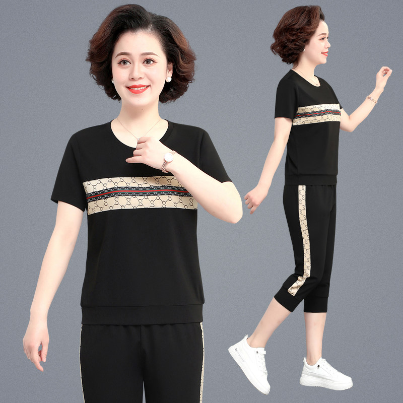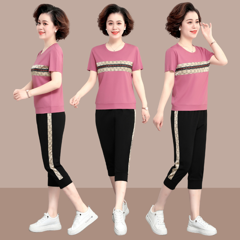 中老年妈妈夏季短袖运动服休闲套装女中年七分裤上衣服跑步两件套