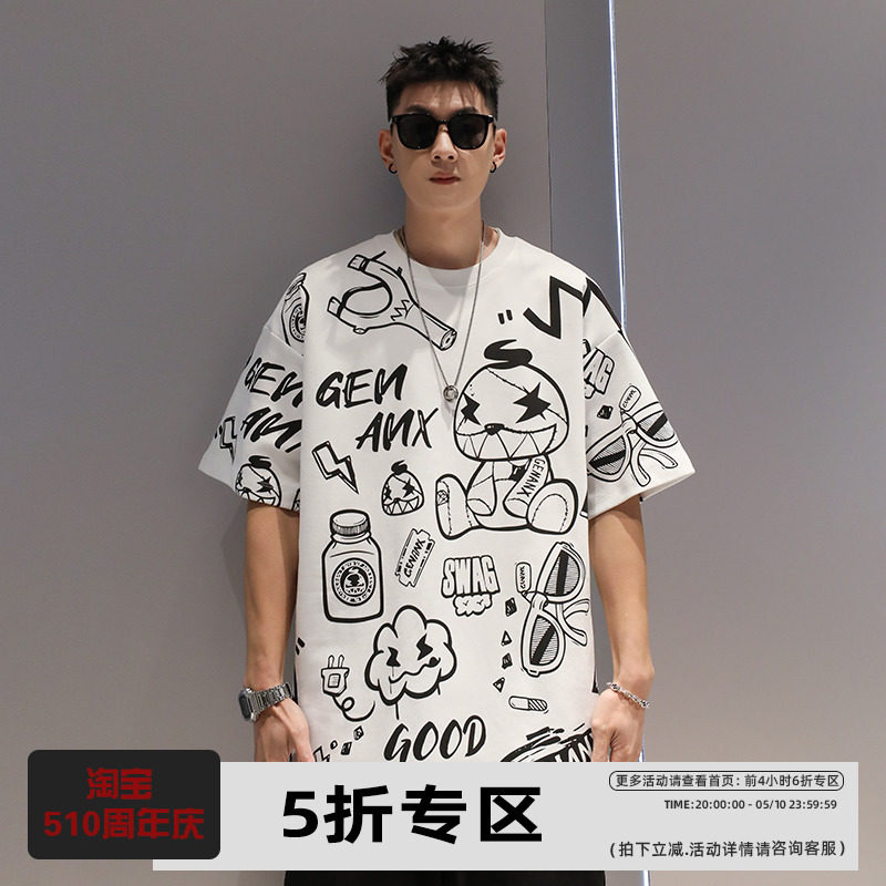 有术原创涂鸦漫画潮牌T恤男士夏季新款设计感时尚休闲情侣短袖