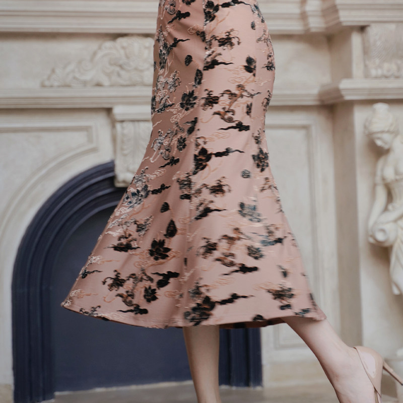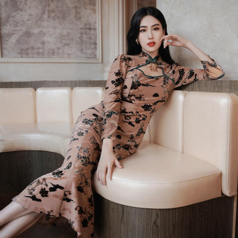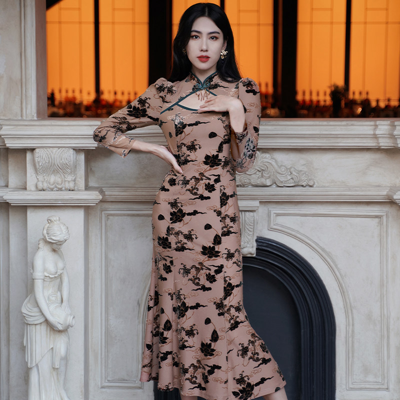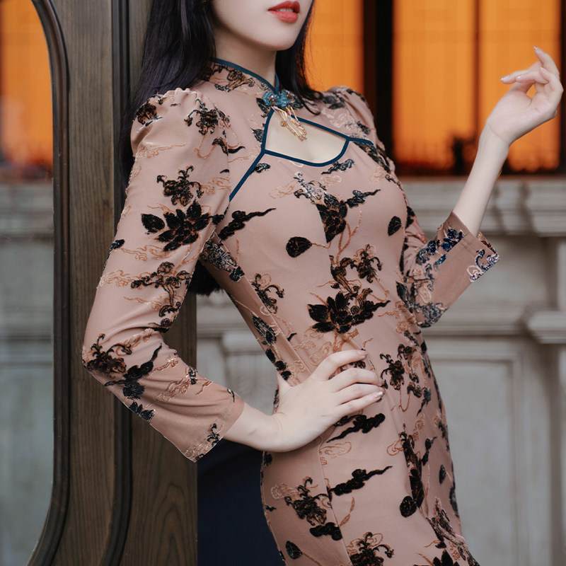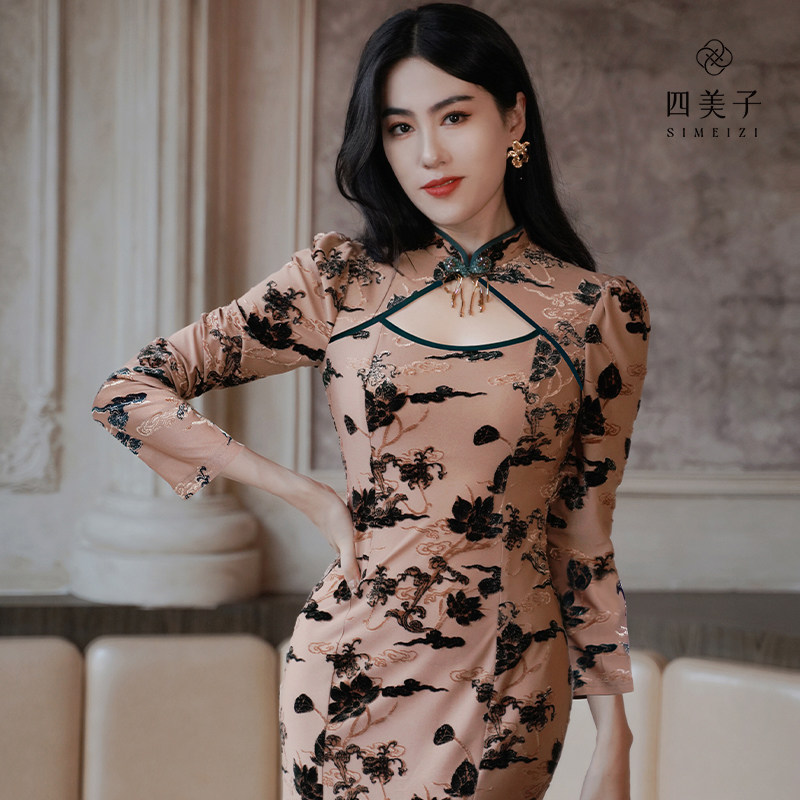 天猫四美子旗舰店,四美子修身暗色旗袍颜如玉感连衣裙,原创设计,秋冬新款烧花旗袍