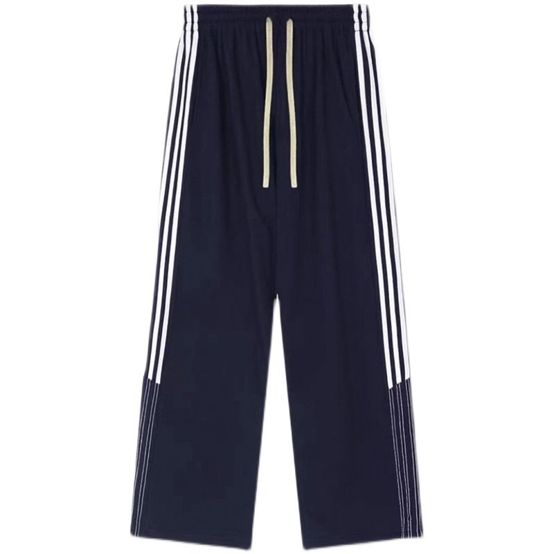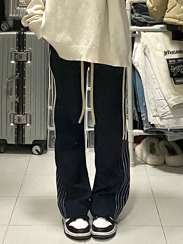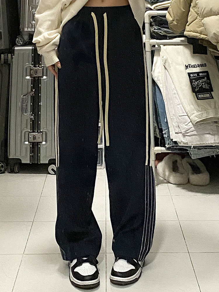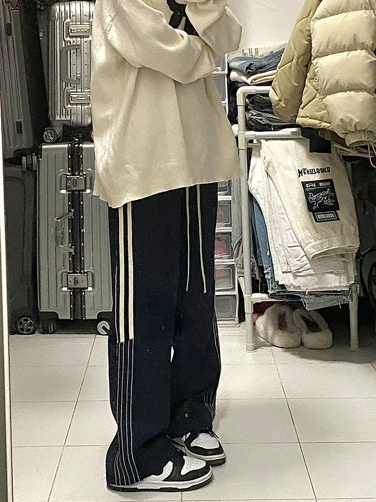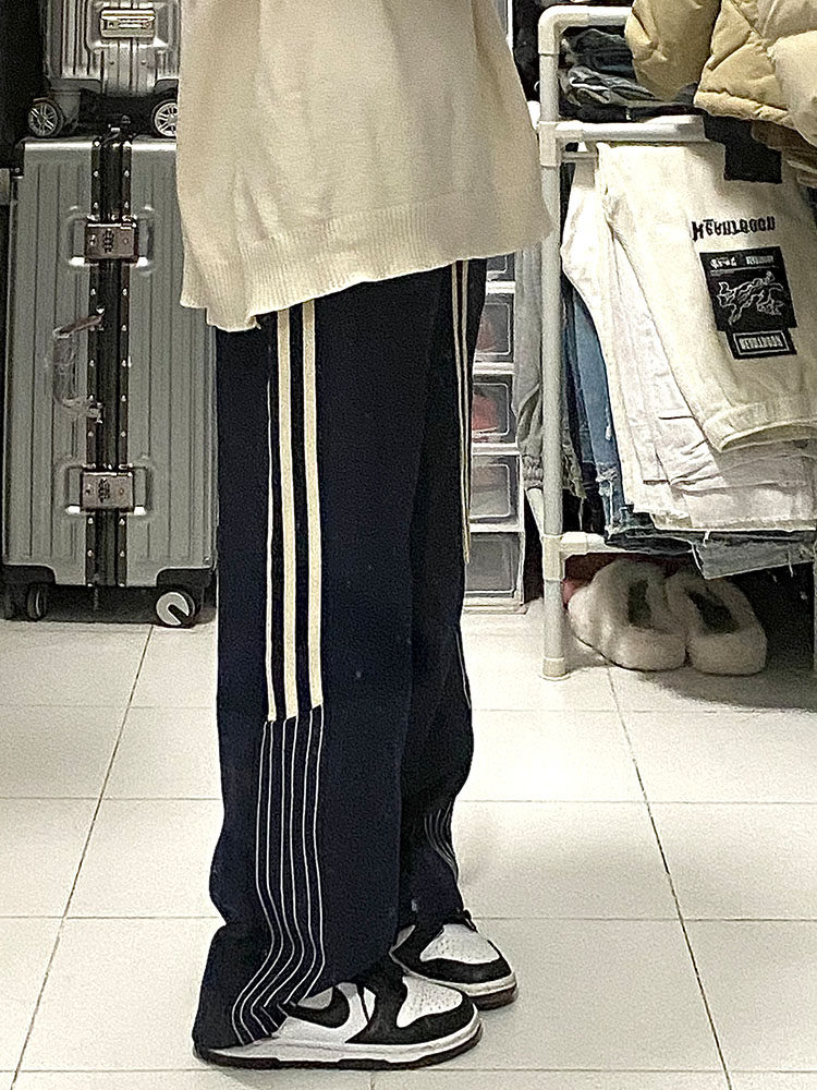 美式学院风裤子2023春秋大码宽松垂感阔腿裤胖mm竖条纹运动休闲裤