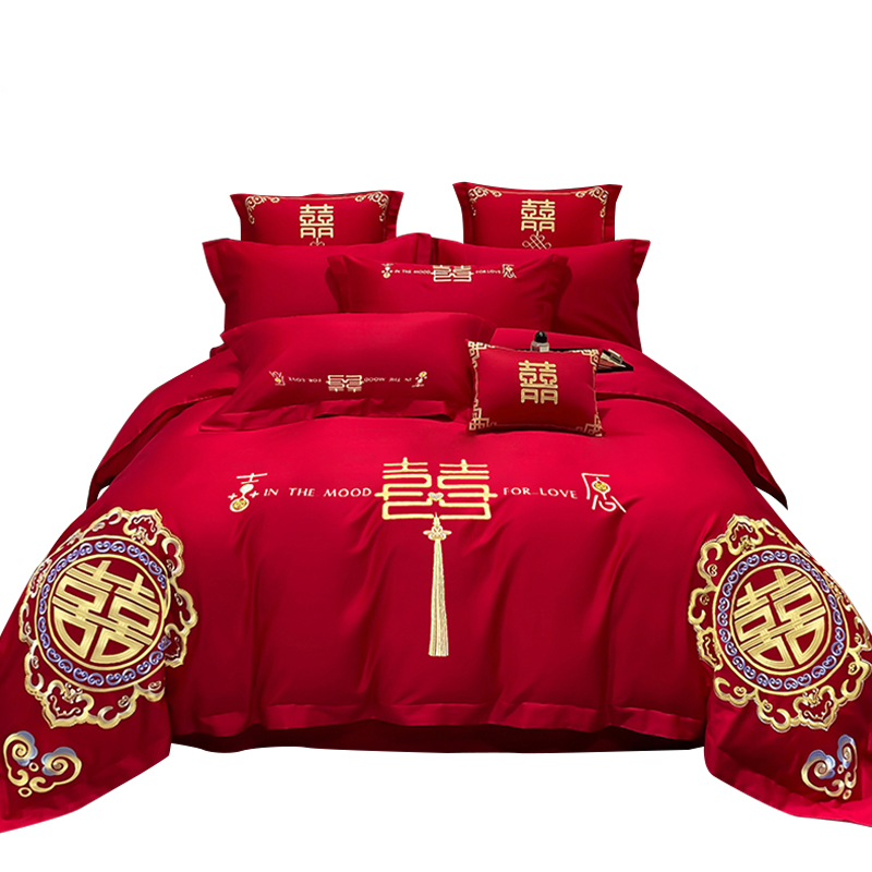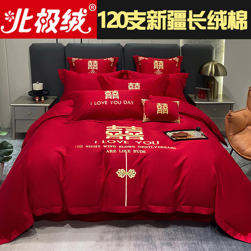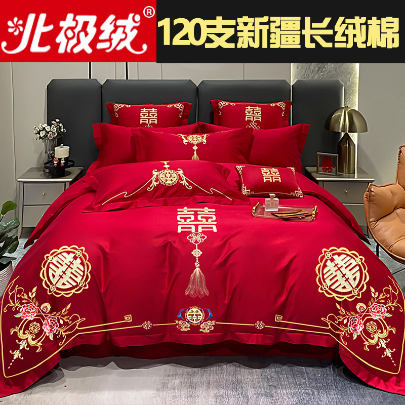 120支新疆长绒棉结婚床上四件套婚床婚嫁全棉婚庆大红色喜被婚房