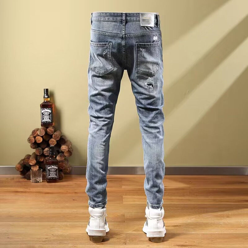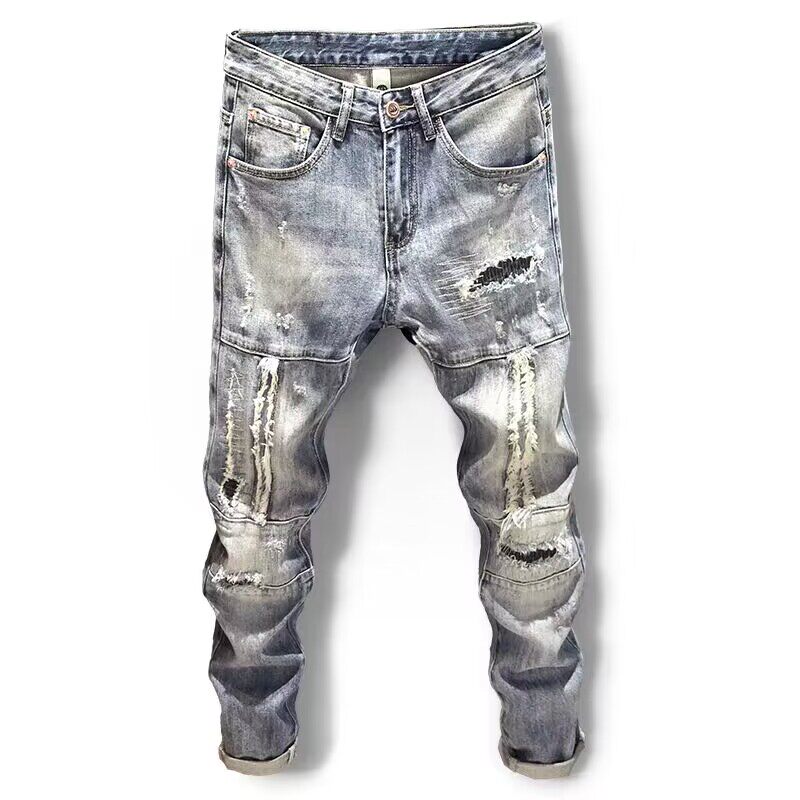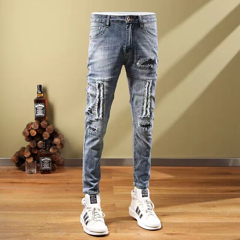 痞帅男款高街浅蓝色牛仔裤男士潮牌弹力拼接补丁贴布破洞小脚裤子