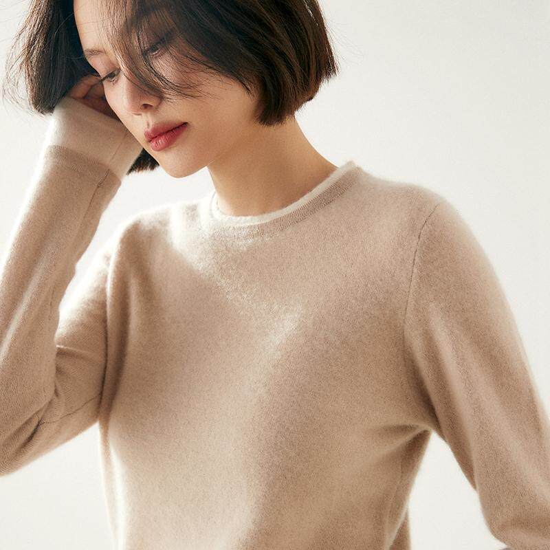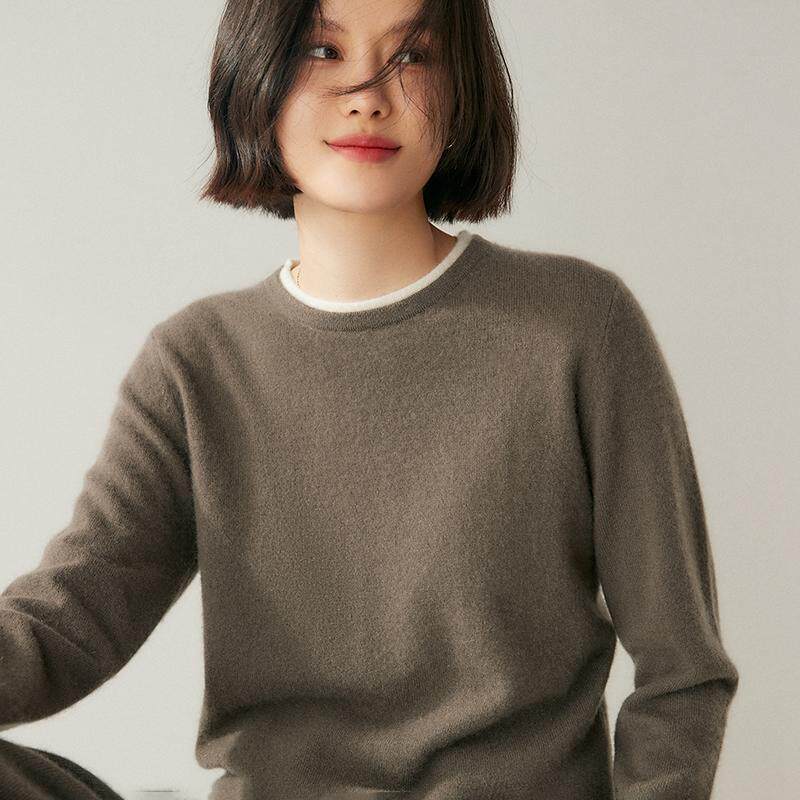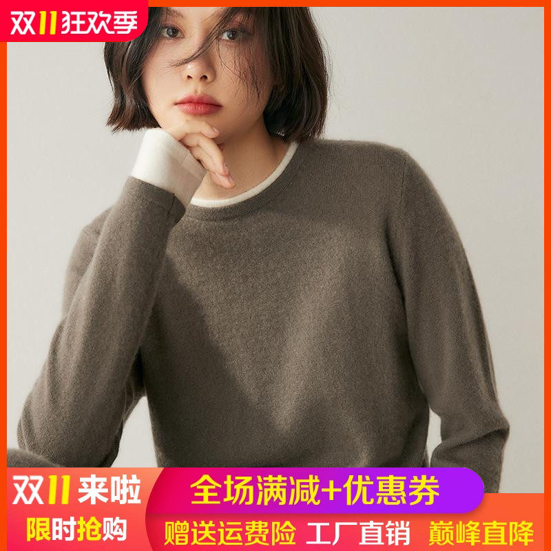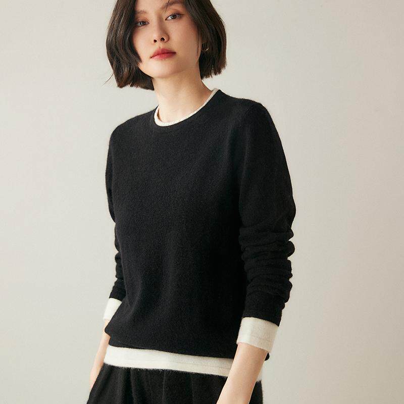 软糯感100%纯山羊绒衫女双层领圆领针织衫宽松毛衣拼色假两件上衣