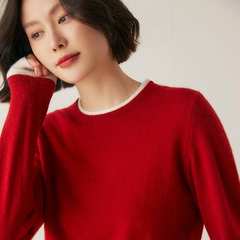 淘宝梦茜韵高端羊绒衫工厂直销店,双层领100%纯山羊绒衫女拼色毛衣