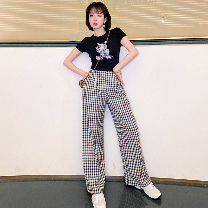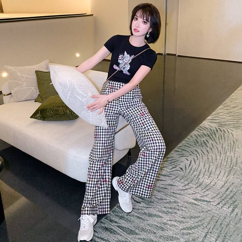 印花修身短款T恤+格纹直筒裤