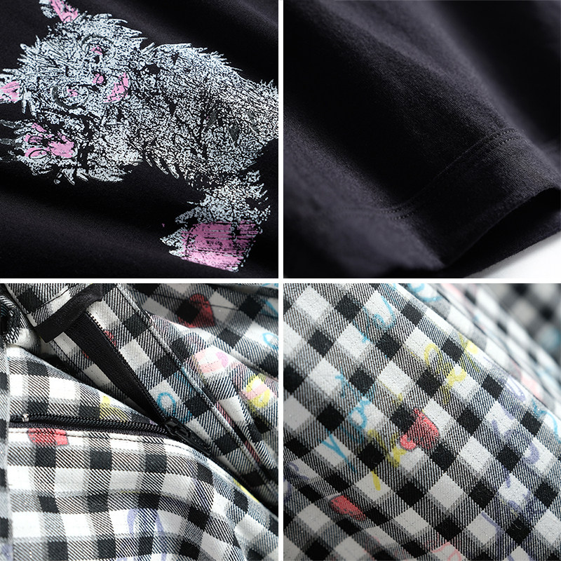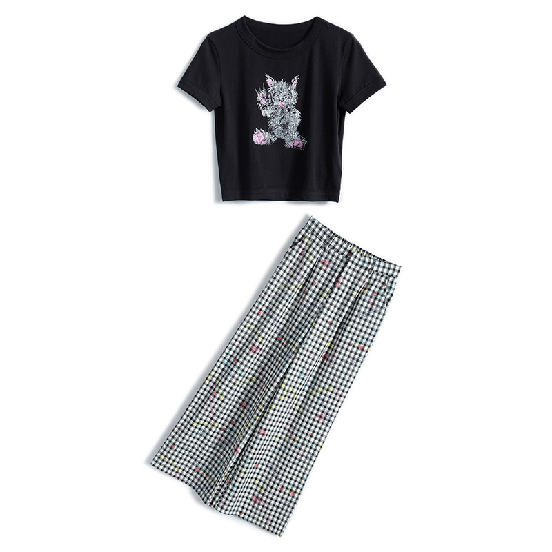 MIUCO小恶魔猫咪印花修身短款纯棉T恤+格纹直筒裤套装2024