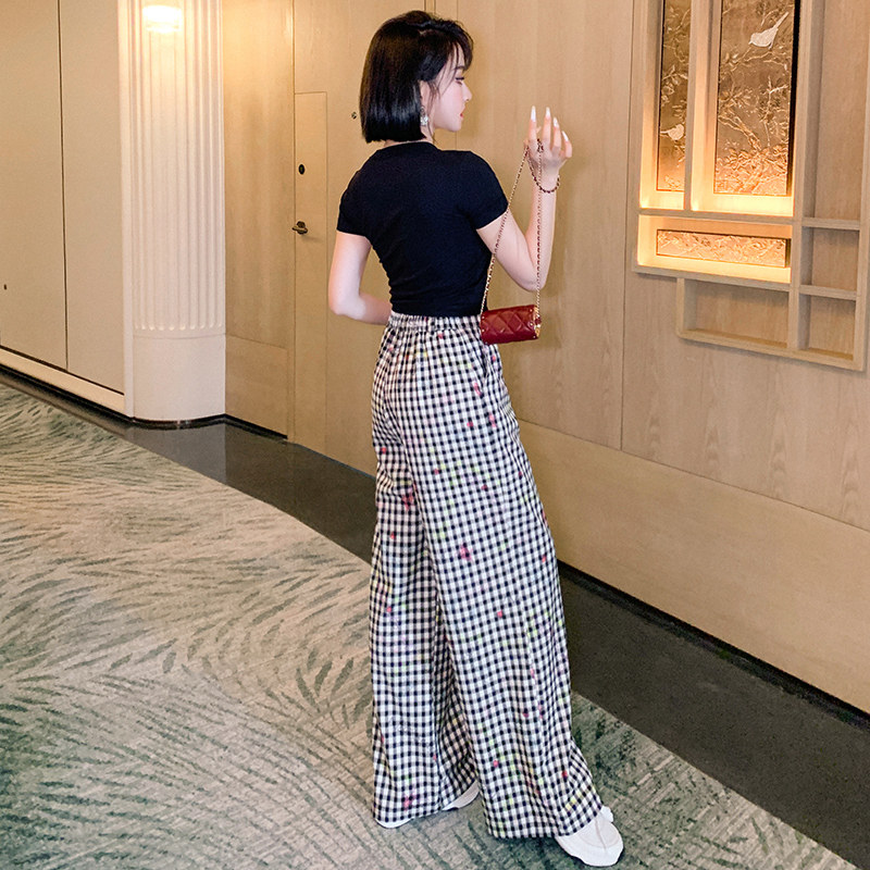 淘宝MIUCO专注高品质快时尚女装,印花修身短款T恤+格纹直筒裤