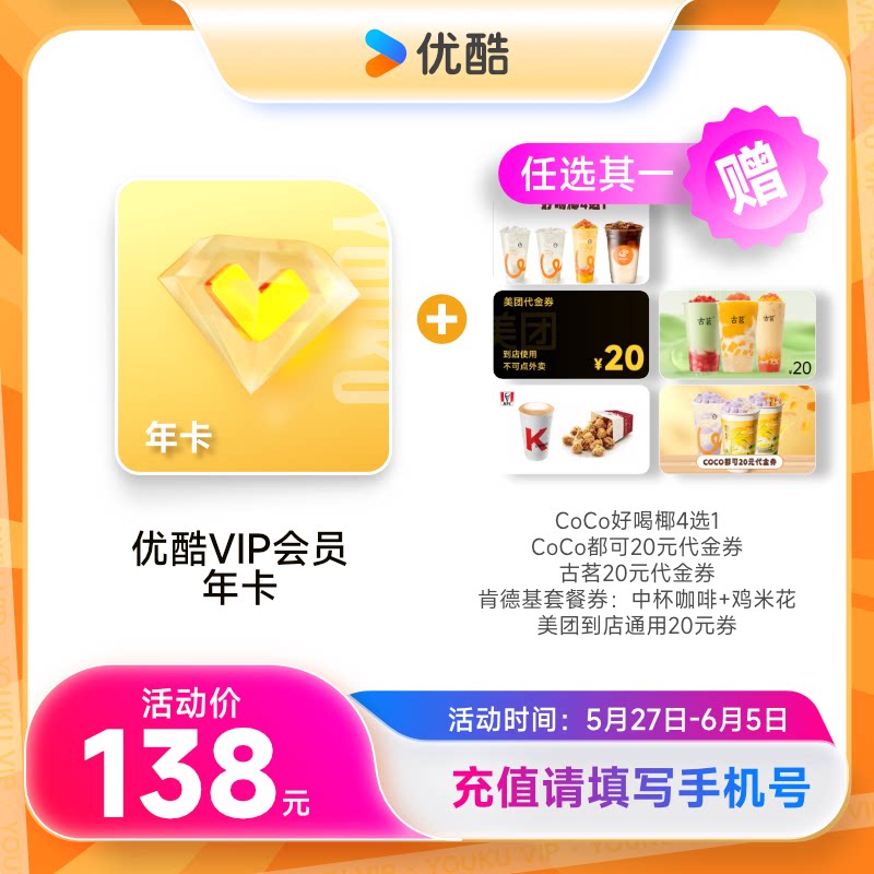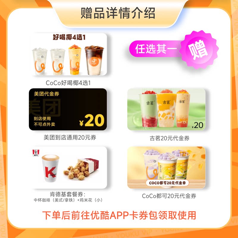 优酷VIP会员年卡赠肯德基套餐CoCo好喝耶古茗美团代金券多选一