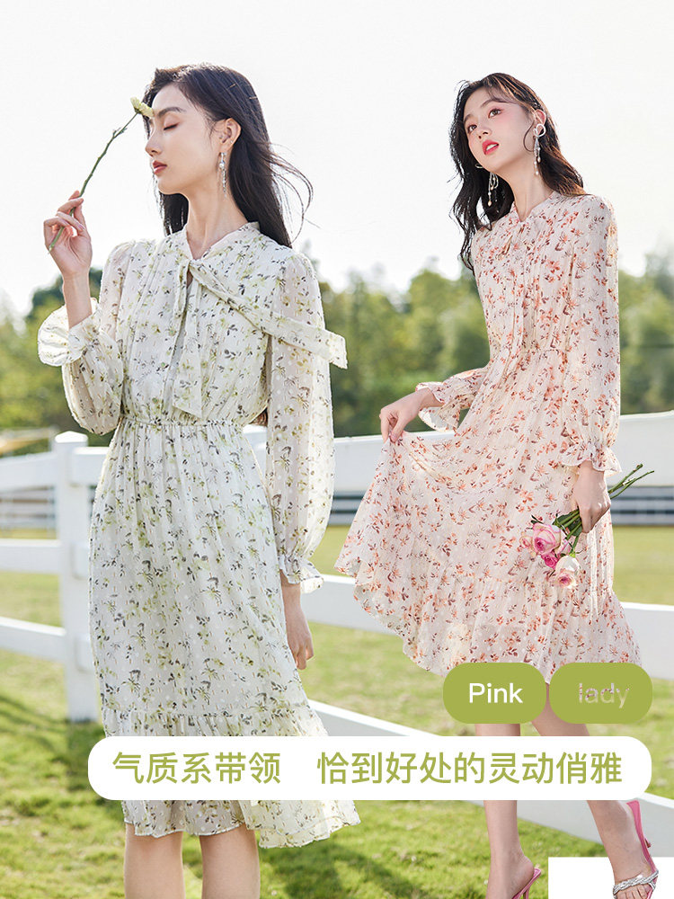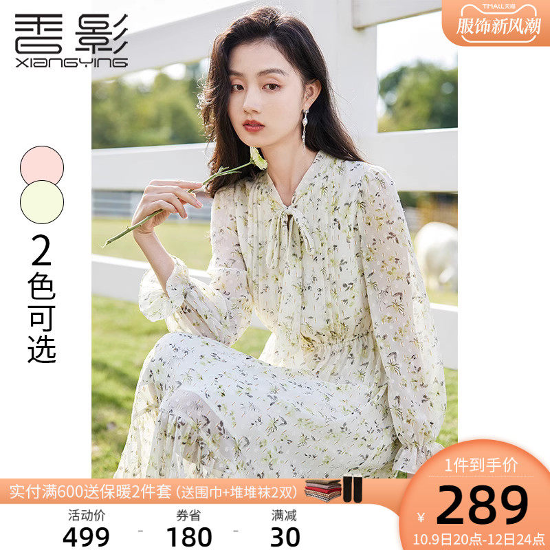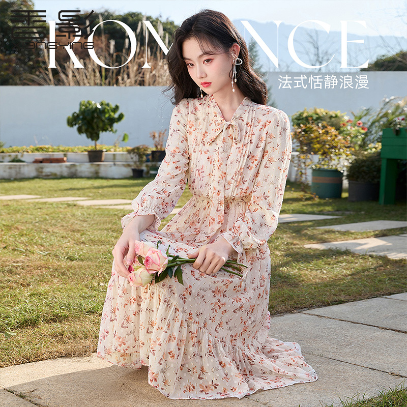 天猫香影官方旗舰店,香影碎花女2023春装新款气质连衣裙,香影气质收腰长袖雪纺连