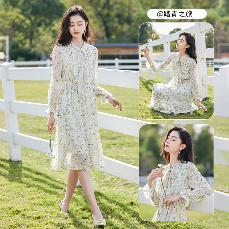 香影雪纺碎花连衣裙女长袖2023秋季新款显瘦气质法式高腰通勤裙子