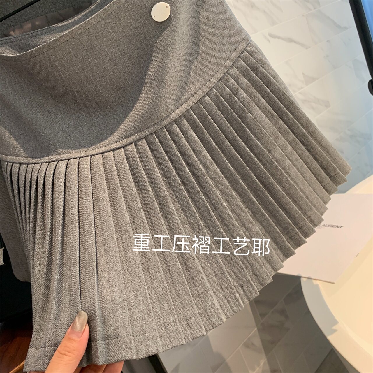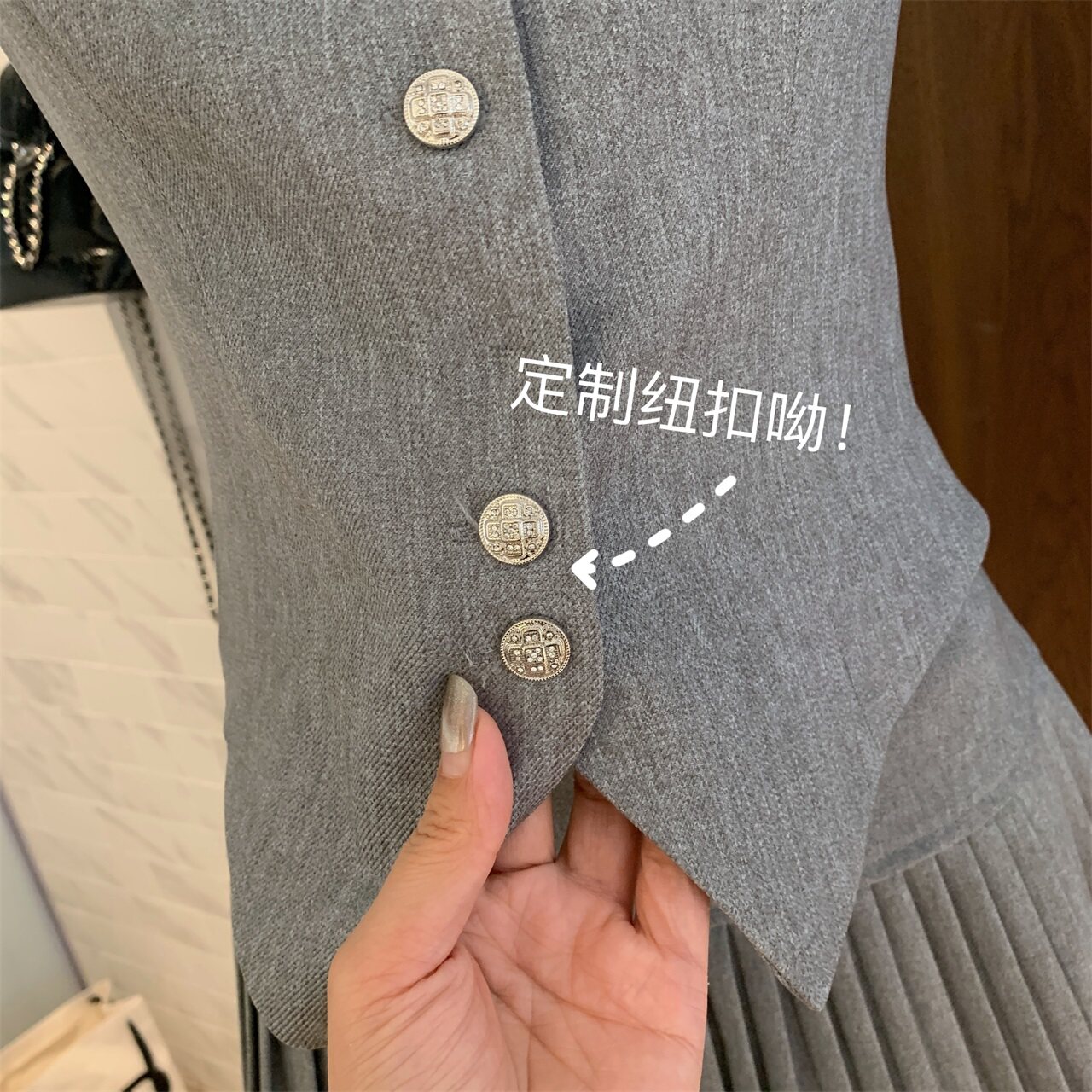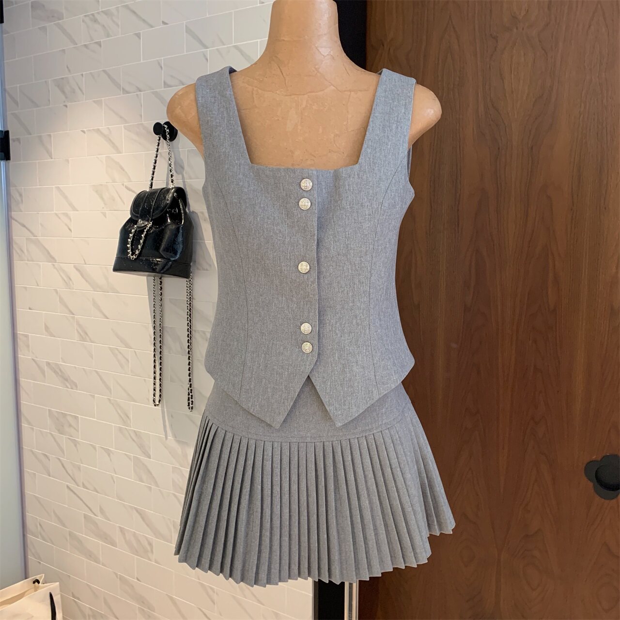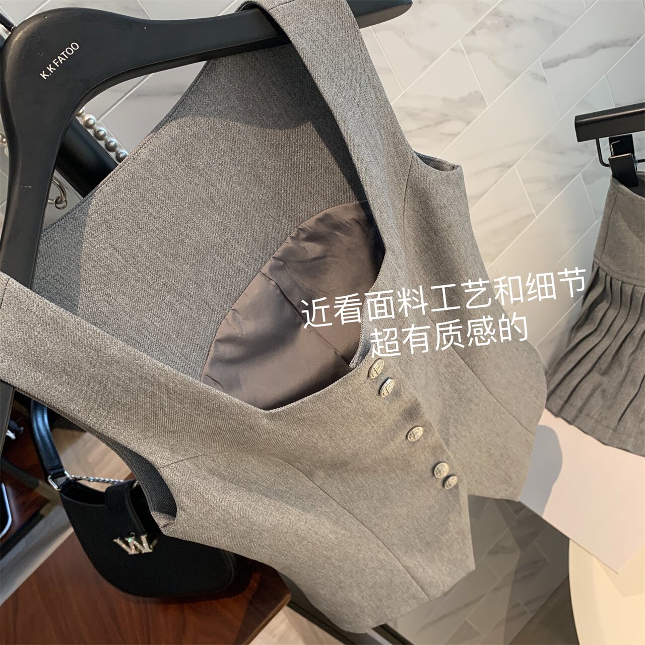 淘宝小K家自制女装FATOO,洋气烟灰色细钻单排扣无袖背心马甲2023夏季宽腰百褶半身裙两件套