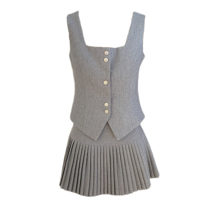 洋气烟灰色细钻单排扣无袖背心马甲2023夏季宽腰百褶半身裙两件套