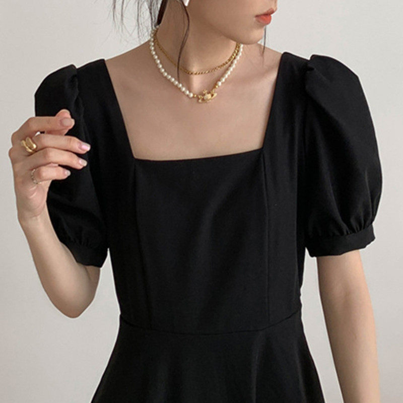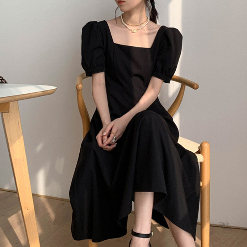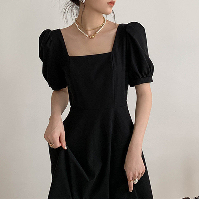 黑色连衣裙女2023夏季新款法式复古气质方领收腰长款赫本风小黑裙