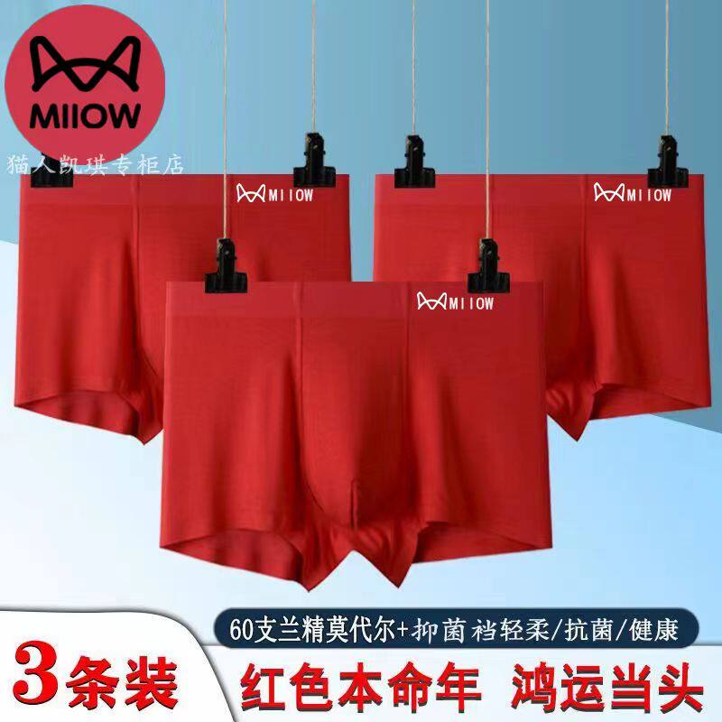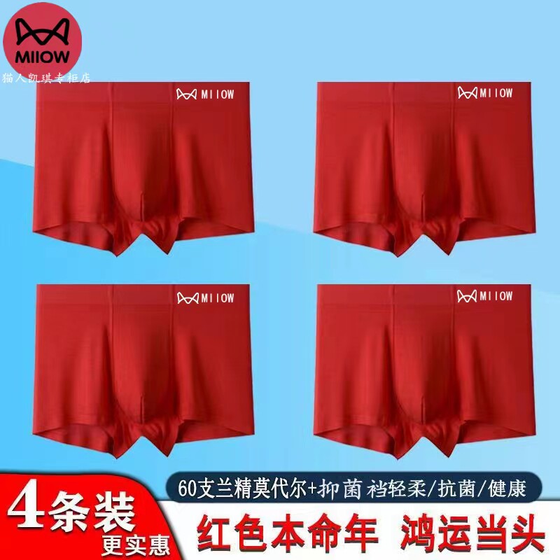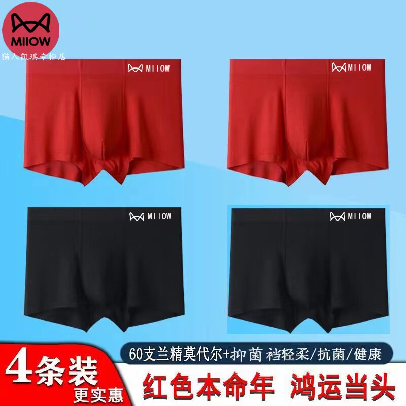 猫人无痕大红色黑色男款内裤60支兰精无痕莫代尔平角四角短裤舒适