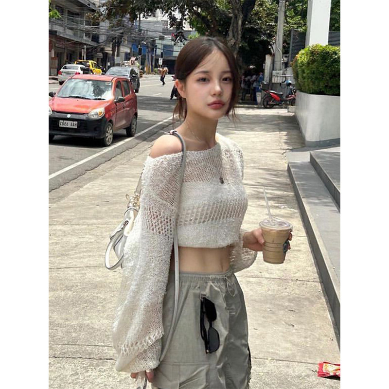 甜酷辣妹镂空短款针织衫女早秋新款长袖防晒罩衫薄款毛衣空调衫