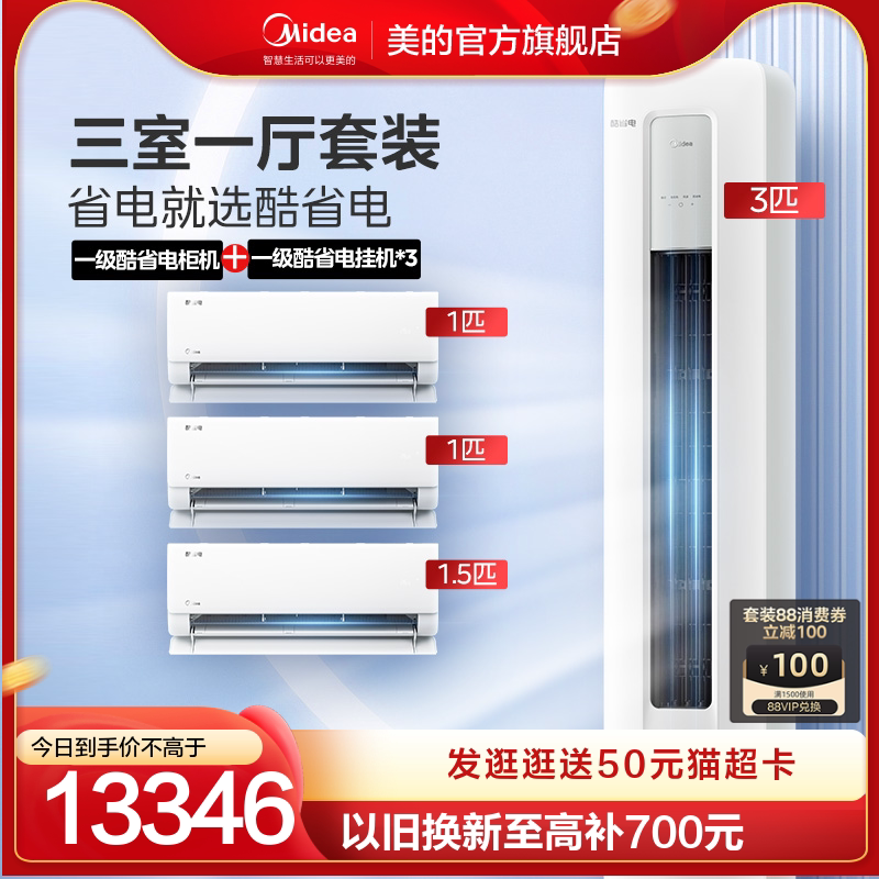 天猫美的官方旗舰店,【三室一厅】美的空调酷省电一级冷暖变频1.5匹+1匹*2+3匹柜套装