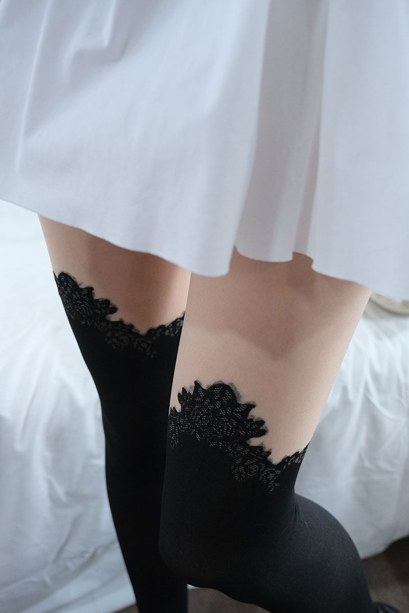 日系性感黑丝假高筒过膝花朵拼接少女蝴蝶结连裤