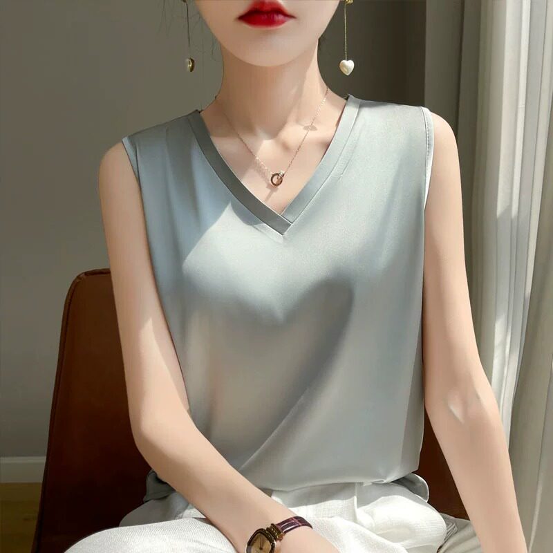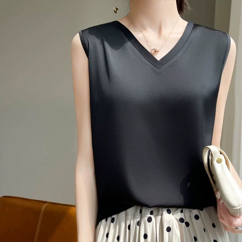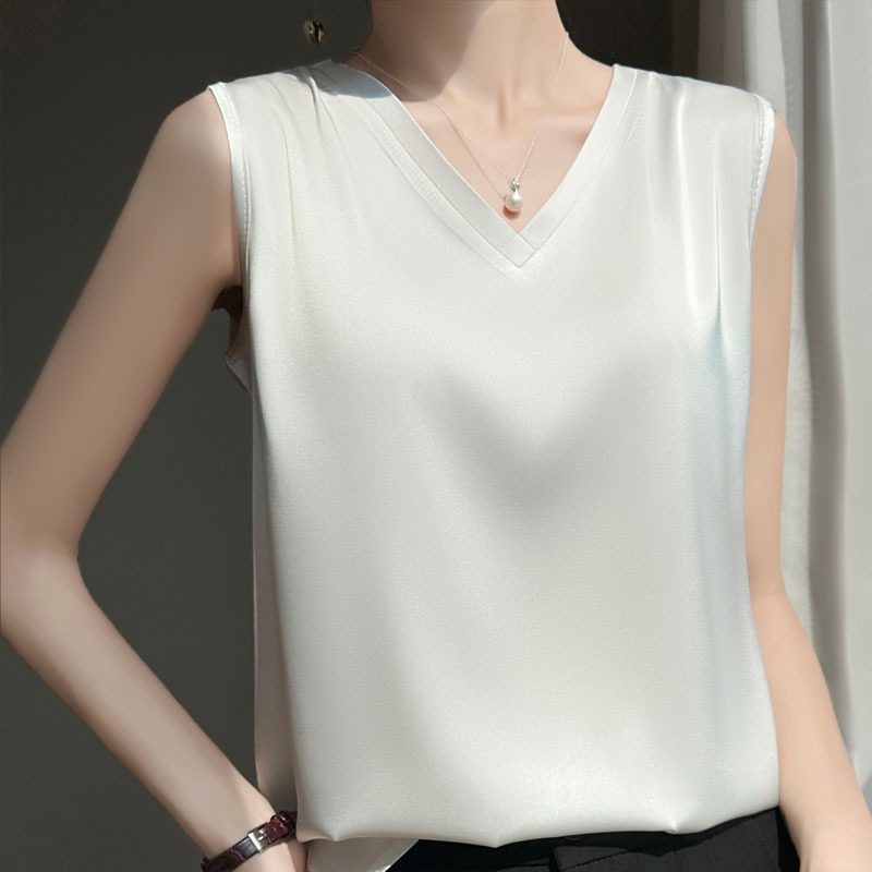 真丝吊带背心女V领无袖T恤桑蚕丝夏打底内搭上衣白色外搭西服
