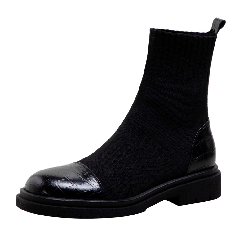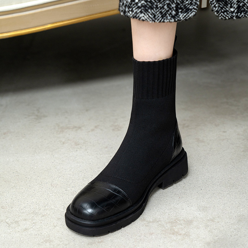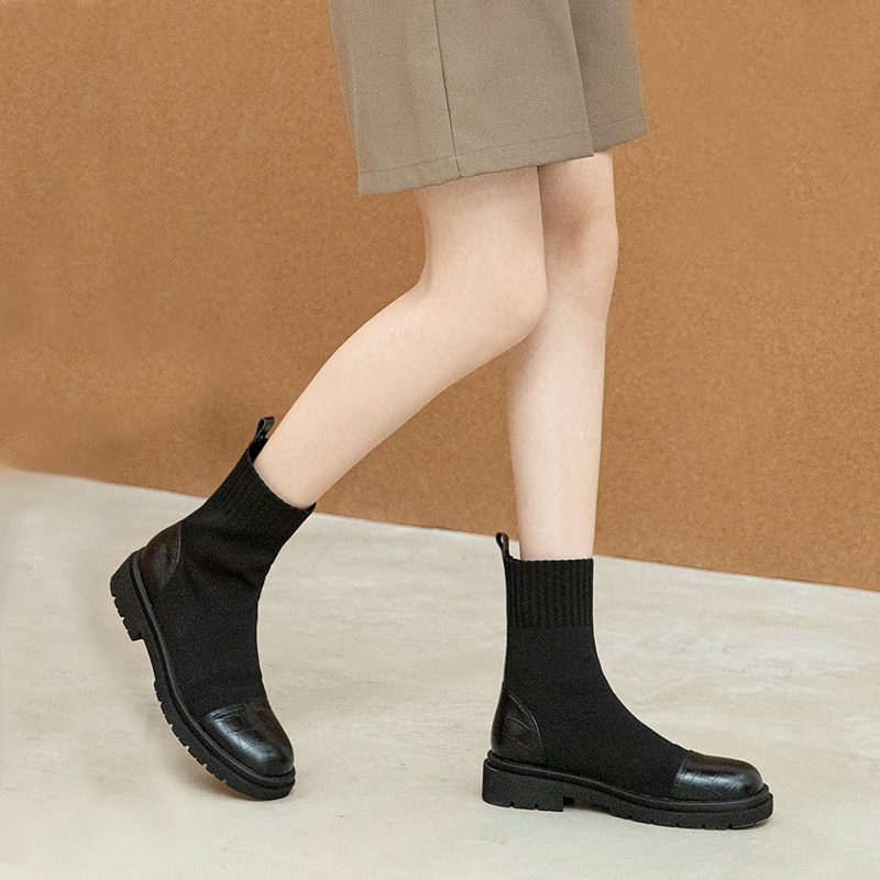 弹力瘦瘦靴女真皮女靴针织毛线短靴2023秋冬袜靴平底靴子黑色棉靴