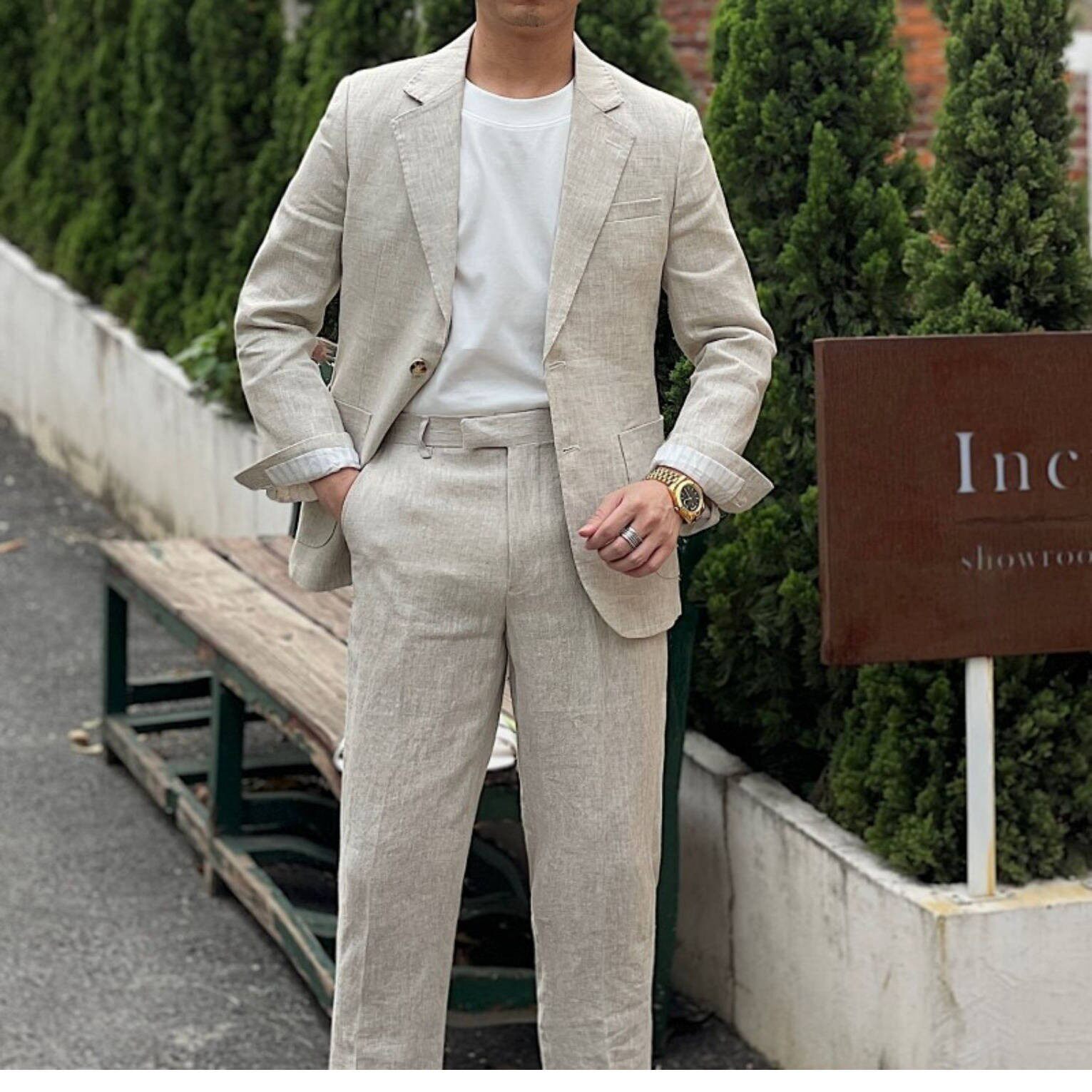胖子大码亚麻时尚显瘦休闲西服套装英伦复古修身西装潮老钱风薄款