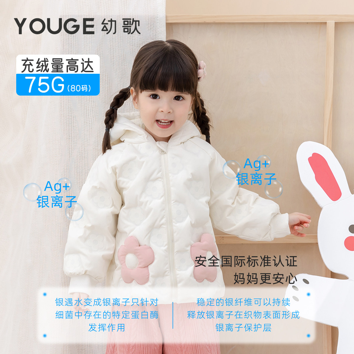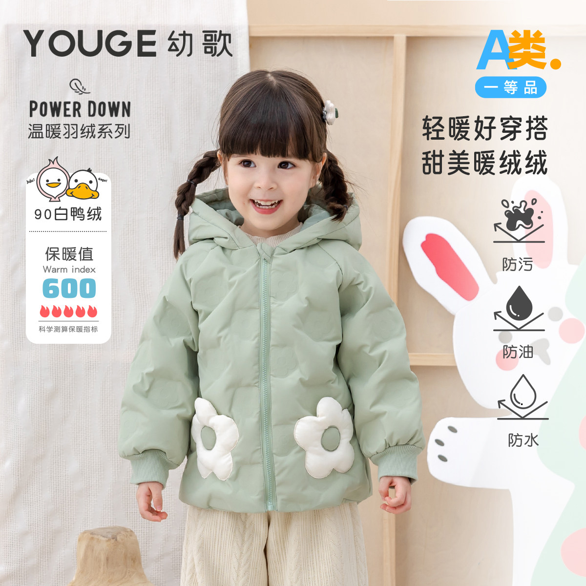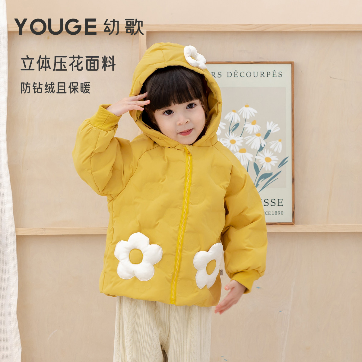 幼歌0异味三防抗菌压花面料花朵造型羽绒服