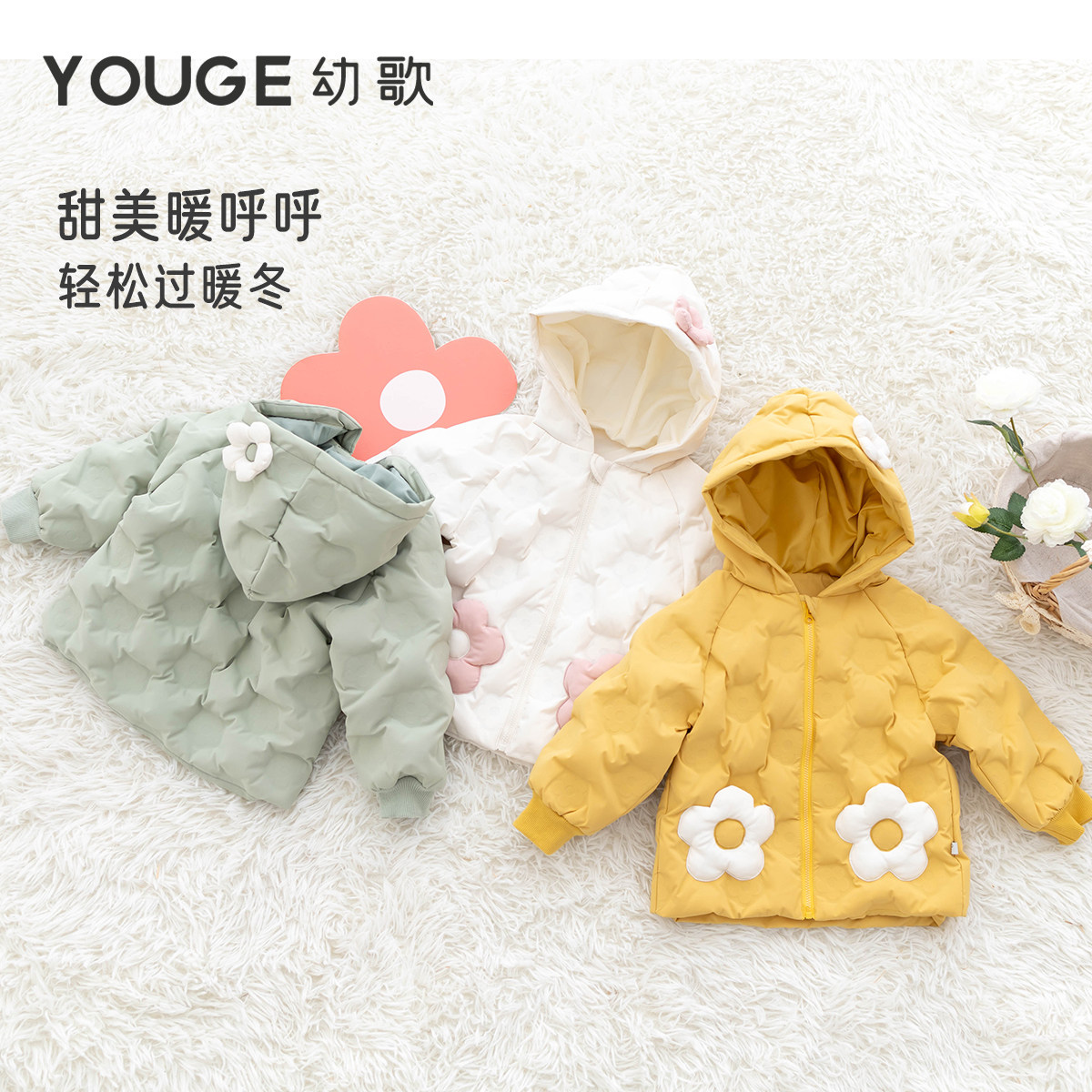 YOUGE幼歌 婴幼儿冬款防污抗菌花朵连帽羽绒服舒适防风保暖外套潮