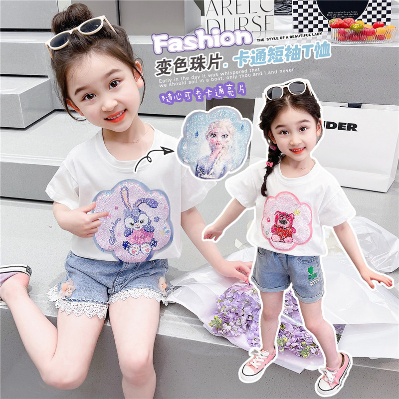 女童短袖T恤爱莎变脸星黛露翻转变色草莓熊珠片女孩卡通亮片t恤