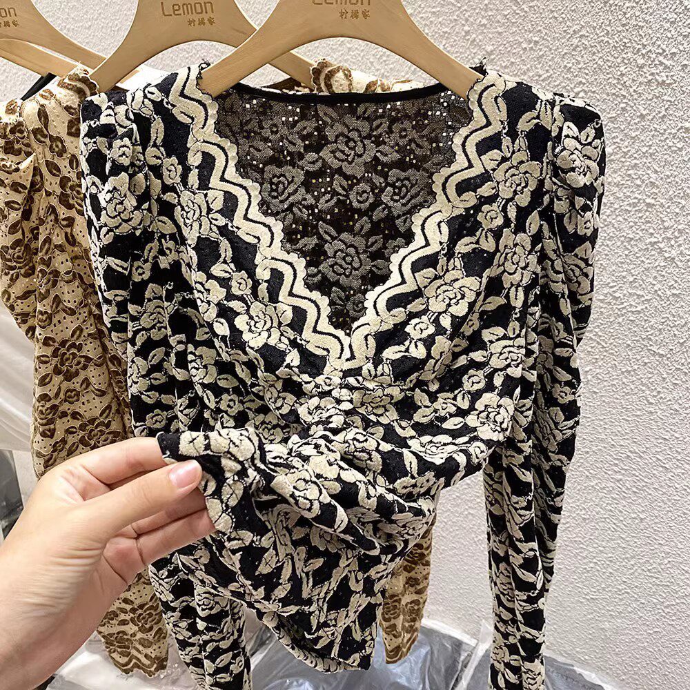 淘宝Lemon 青柠檬女装,2023法式气质V领衬衫女秋季设计感小众高级感泡泡袖修身打底上衣